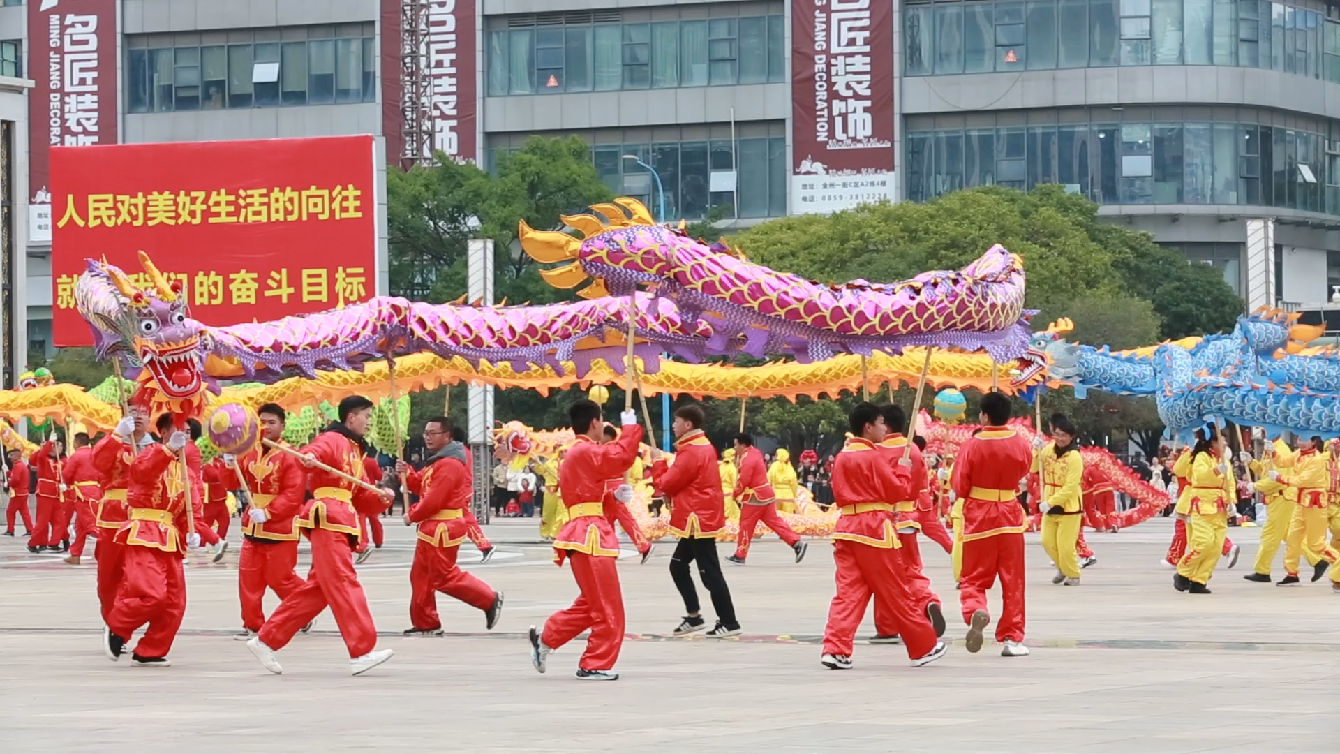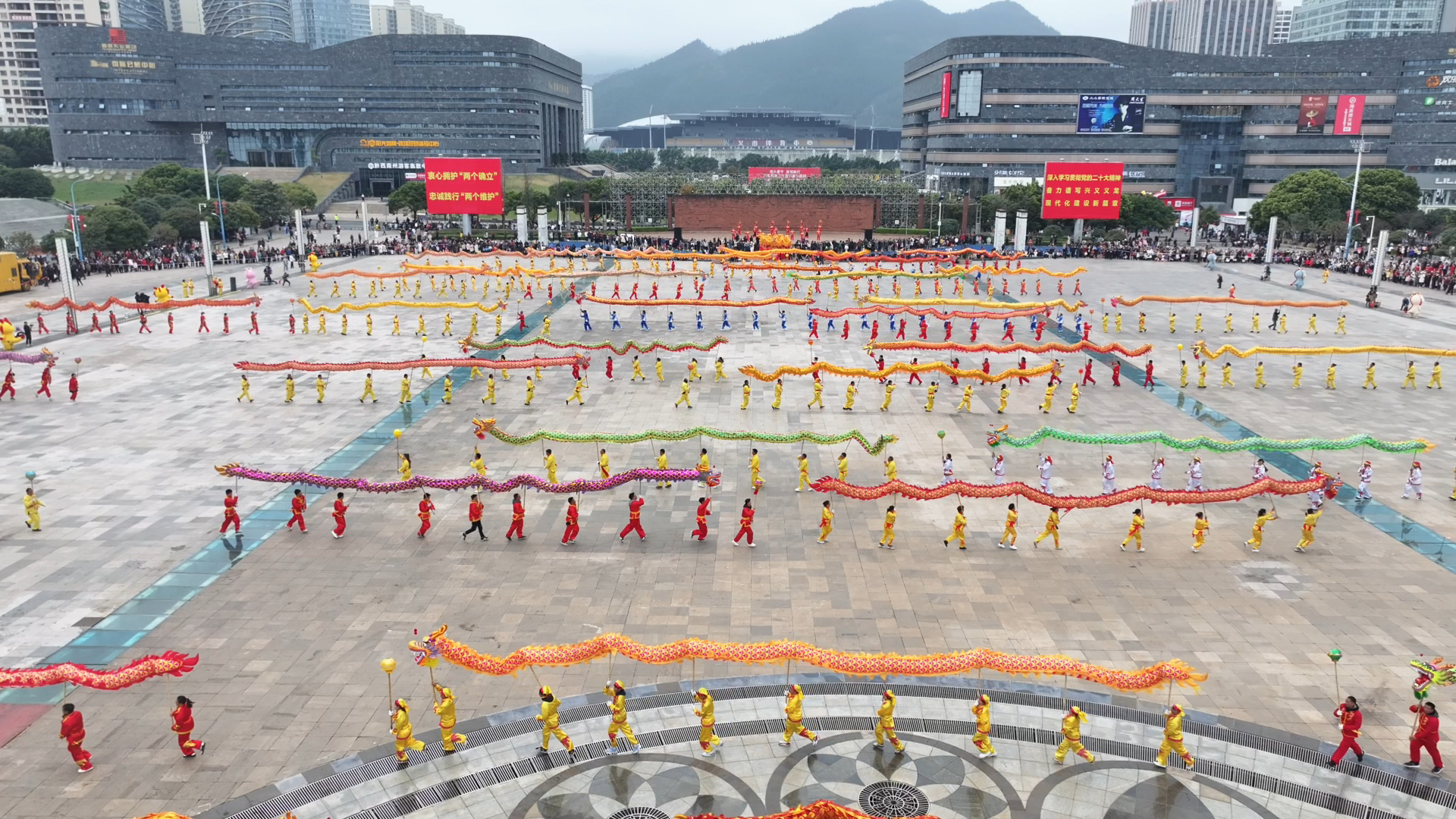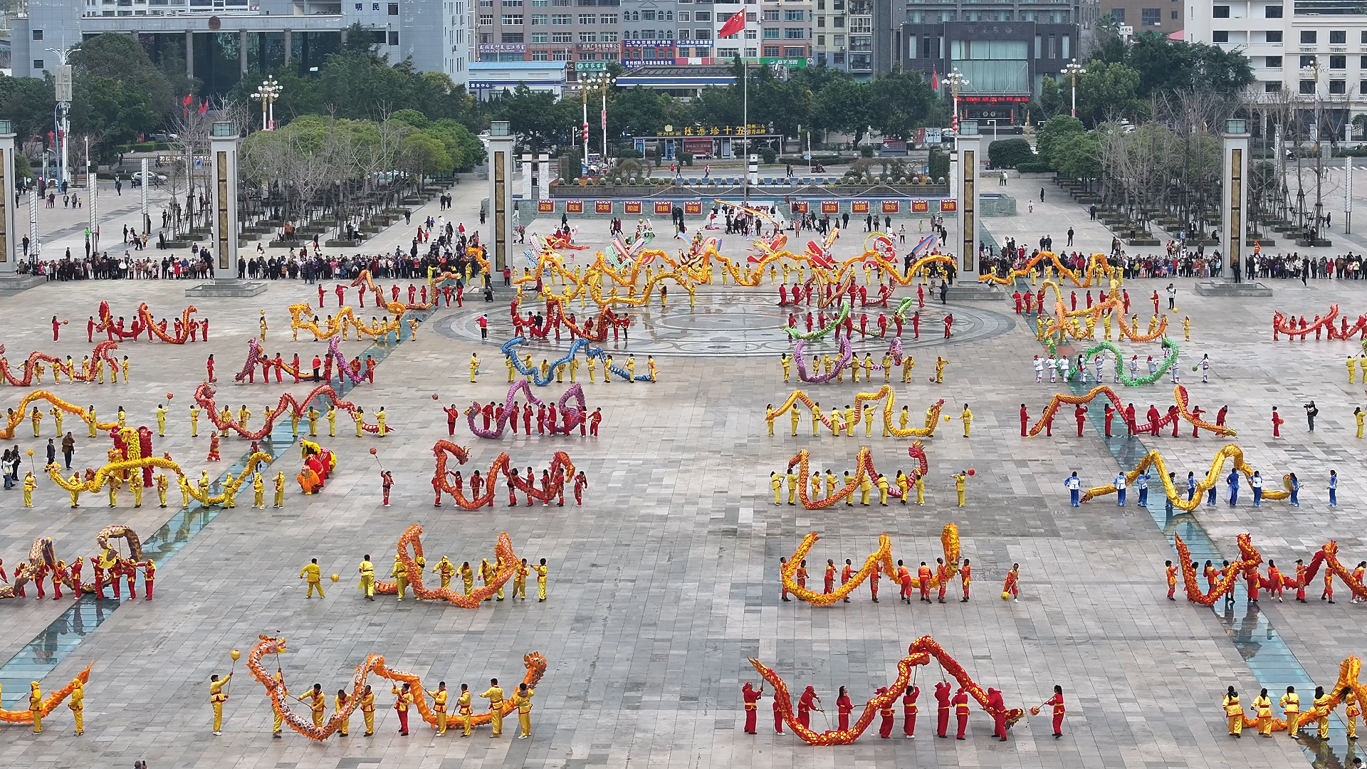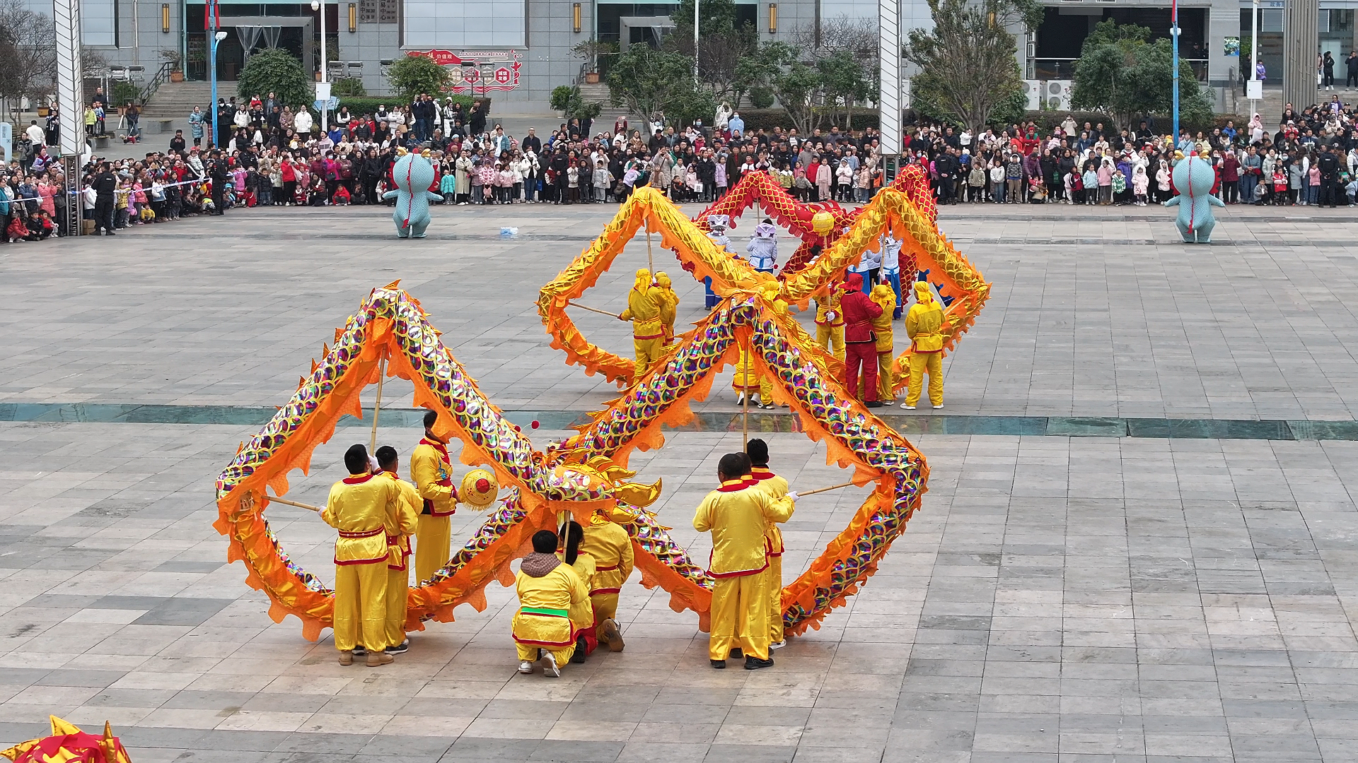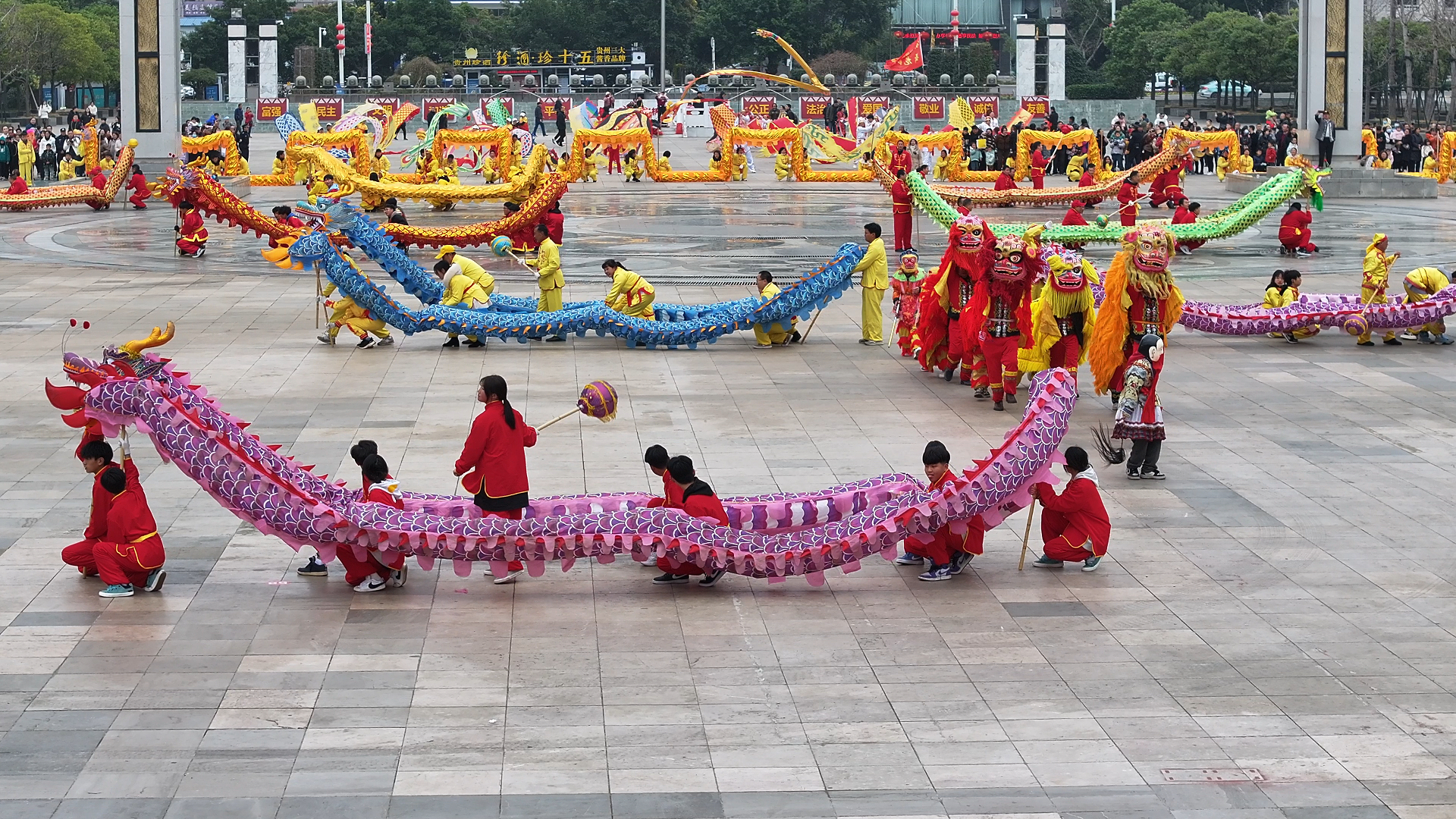 以“万峰成林处·金龙闹新春”为主题的舞龙、舞狮活动在兴义市的新城区桔山广场开展集中定点展示和巡游展示,当天晚上,6条九把一珠龙和4只舞狮队伍在老城区街心花园定点展示和巡游展示,一老一新的展示巡游地点也见证了当地的发展和变化。