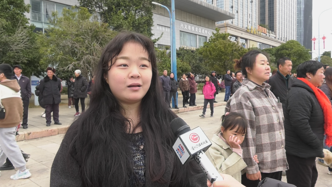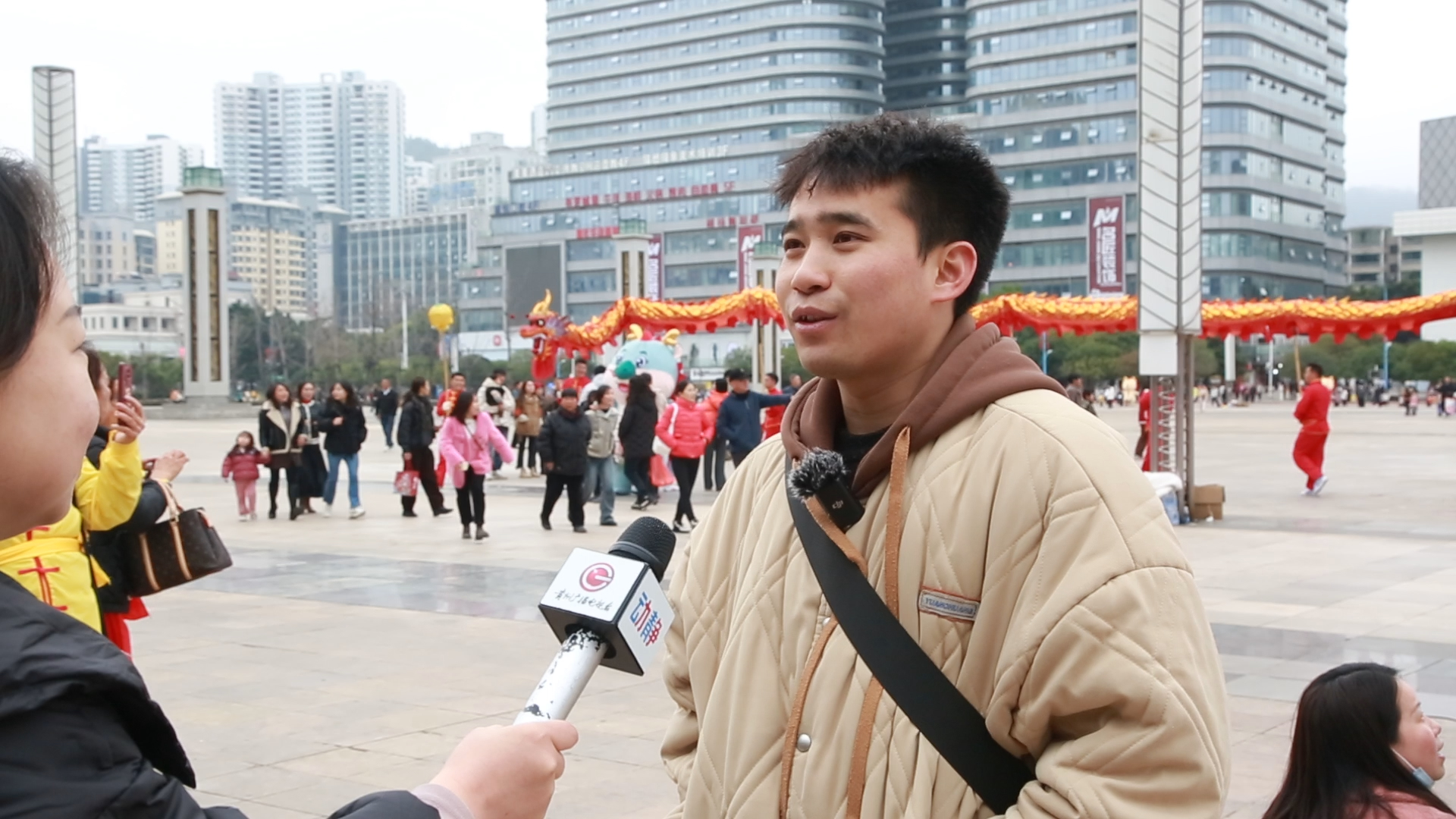 兴义市民 李槟延:今天是正月十五元宵节,到桔山广场看到这么多,有136条金龙还有彩龙在那里舞动,节日氛围非常浓厚,非常喜庆,今年我们从初一到初八都是在本地游玩,活动非常丰富,看到很多龙在油菜花里面巡游,而且天气也非常好。现在兴义的文旅发展是越来越好了,作为当地人我们感到非常自豪,希望2024年黔西南的文化旅游发展越来越好,当地老百姓的生活也越来越丰富多彩。