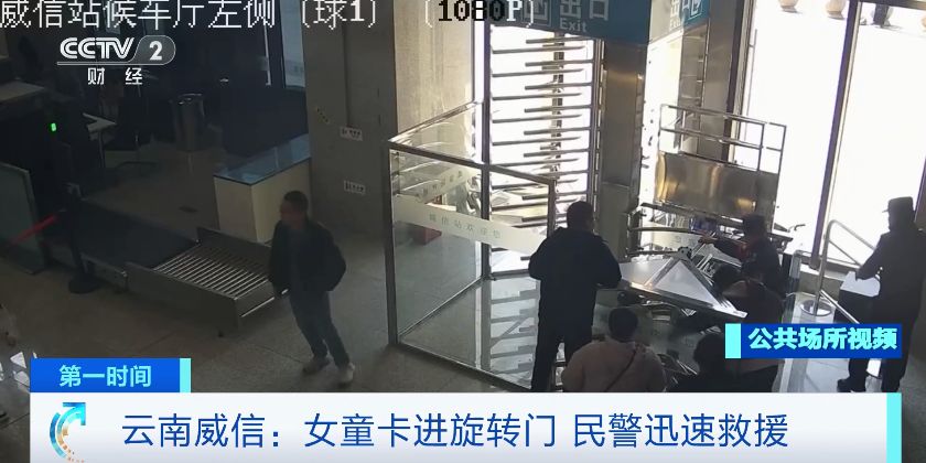 近日,在云南威信站发生惊险一幕,一名女童颈部卡在单向出口旋转门缝隙中,无法脱身。在远处执勤的民警听到女童的哭声,立即赶往现场查看情况。