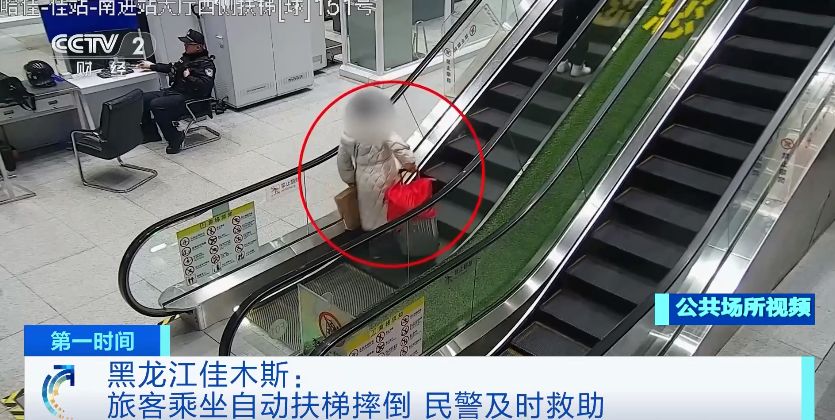 2月12日,在黑龙江佳木斯站南进站口,旅客原女士携带多件行李乘坐自动扶梯时,因行李突然倾斜导致身体失衡,仰面摔倒在运行中的扶梯上,情况十分危险。正在安检口执勤的民警发现后,迅速冲到扶梯旁,第一时间按下紧急停止按钮,并将她扶起。