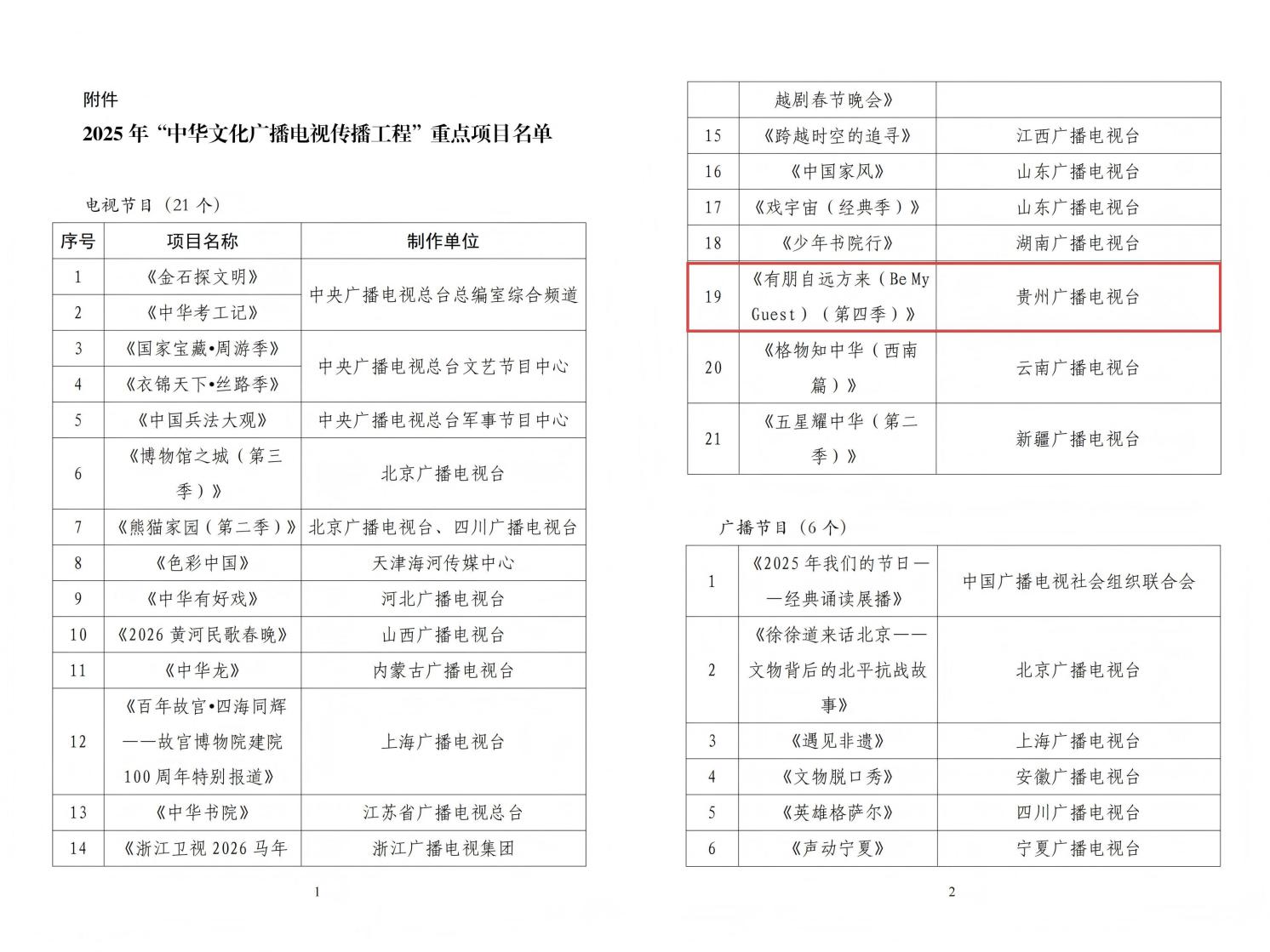 近日,国家广播电视总局公布2025年“中华文化广播电视传播工程”重点项目名单。贵州广播电视台卫视中心、国际传播中心原创国际传播节目《有朋自远方来(Be My Guest)(第四季)》入选。