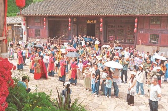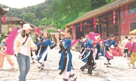 7月12日,安顺市云峰屯堡景区内,《跟着九哥逛屯堡》沉浸式剧目正精彩上演。该剧目融合地戏、花灯等艺术形式,以原创屯堡歌曲《九哥》为主线,精心编织“摔坛出征”“庆功贺宴”“屯边戍守”“家业兴盛”四幕场景,带领游客穿越六百多年时空,感受屯堡人的忠义仁勇和家国情怀。