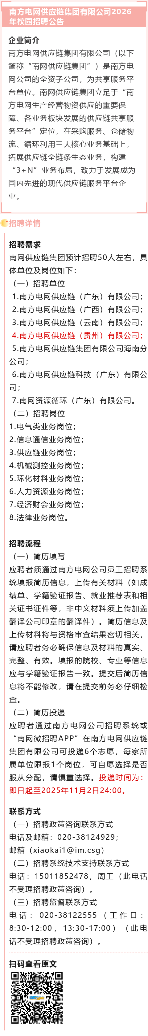 【国企】南方电网供应链集团有限公司招聘50人!报名截止时间:11月2日!