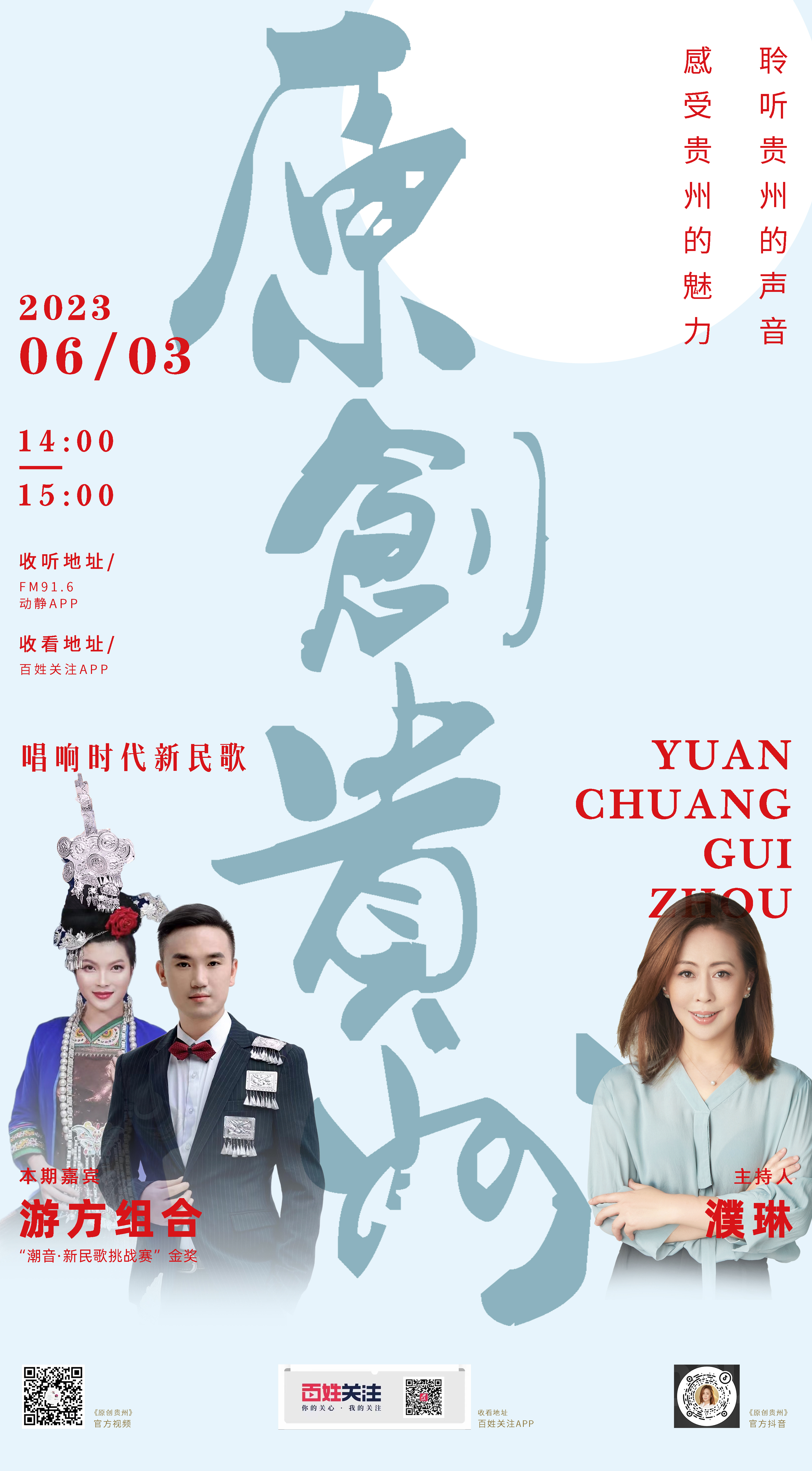 FM91.6贵州音乐广播6月3日14:00,“潮音·新民歌挑战赛”金奖“游方”组合走进《原创贵州·对话》,唱响时代新民歌。