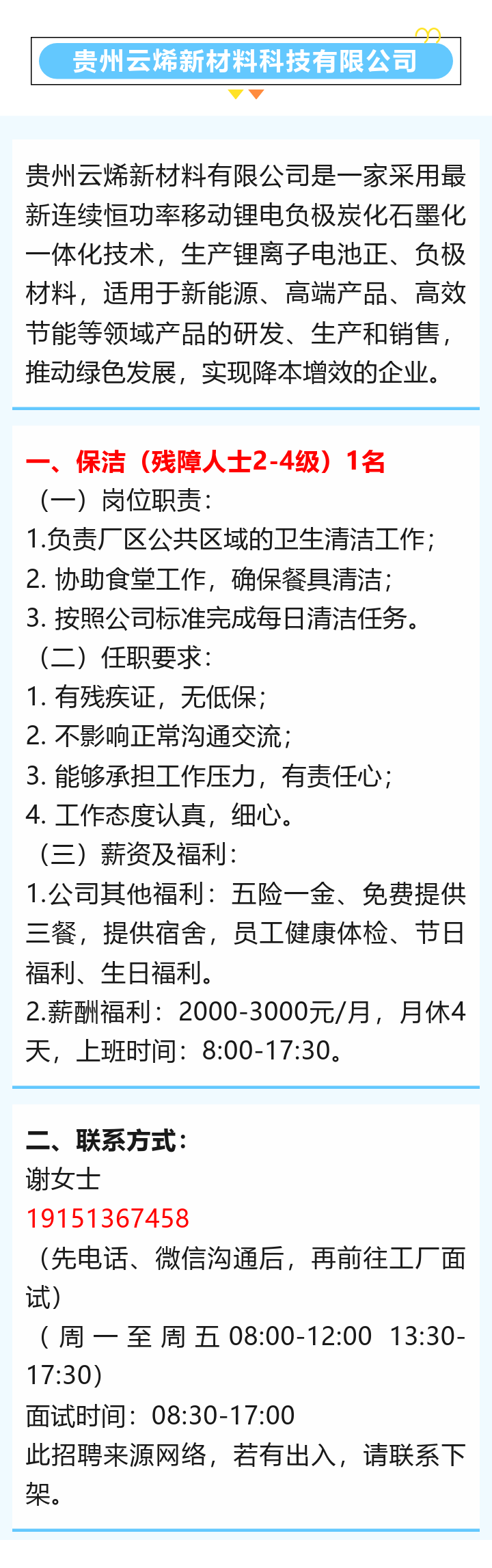 贵州云烯新材料科技有限公司招聘!残障人士可报!五险一金!免费提供三餐、提供宿舍!