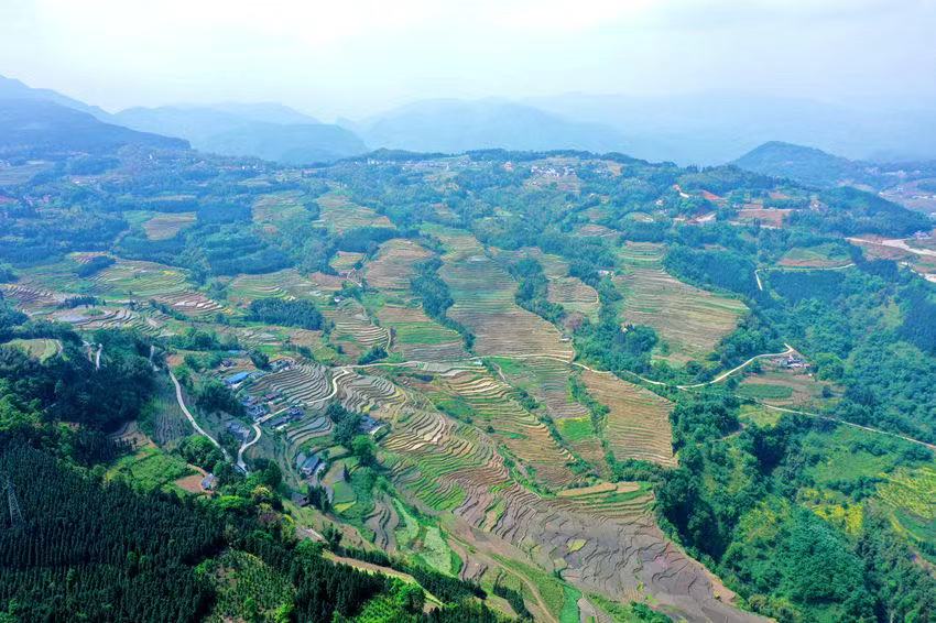四川筠连:千亩梯田美如画 传统劳作插秧忙