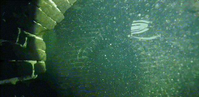 潜入黑暗的水中,沿着城墙游向烽火台,可以看到烽火台从岸边探出水面。