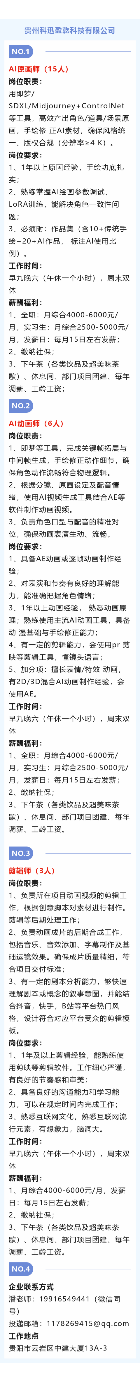 贵阳市云岩区招聘剪辑师、AI动画师、AI原画师!周末双休!