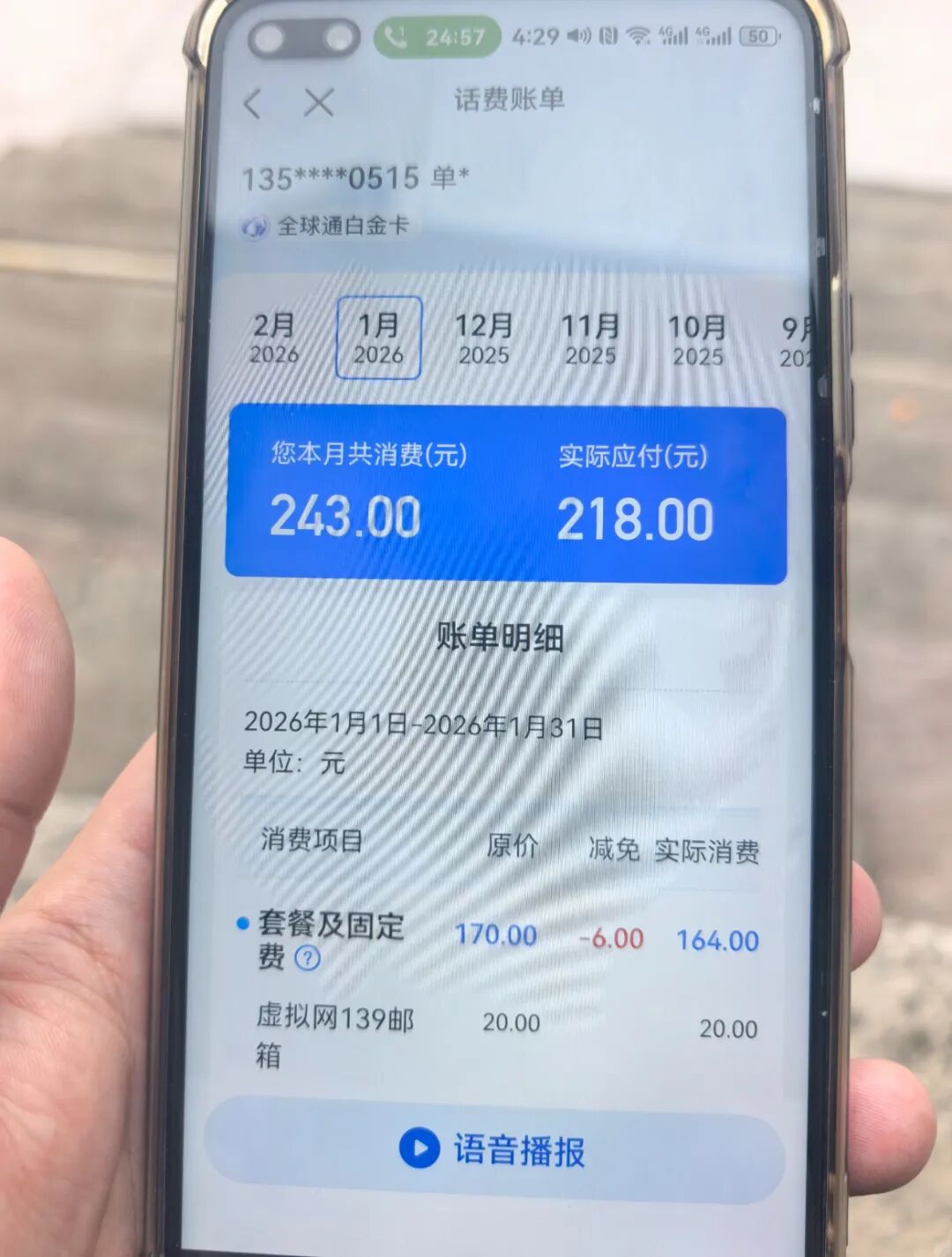 3月2日,楼先生告诉潇湘晨报记者,每月40元的“电视VIP包”他们既不知情,也没有使用过这项服务。楼先生提供了父亲2026年1月的账单明细,消费243元,包括套餐及固定费,增值业务费以及其他费用。在78元的其他费用中,有一项“代移动高清”,楼先生咨询移动客服后被告知是“电视VIP包”。