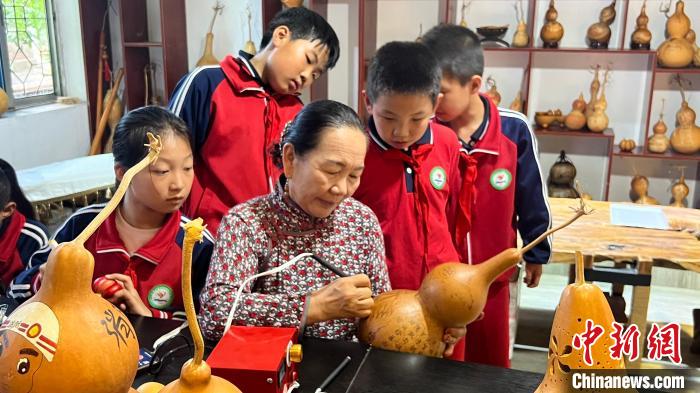陶瑞珍创作的葫芦刻画引学生围观。 徐英凡 摄