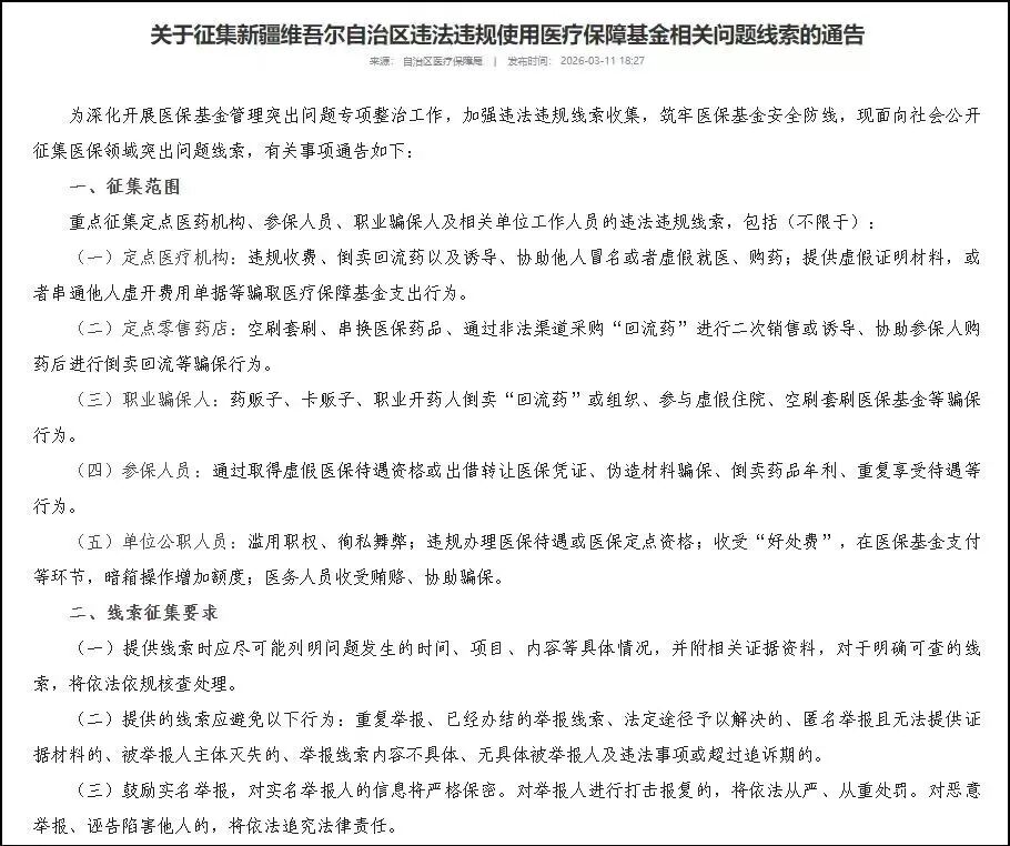 据国家医疗保障局消息,近日,为深化医保基金管理突出问题整治,充分调动广大人民群众参与医保基金监管的积极性、主动性,全国各地医保部门陆续发布公告,面向全社会公开征集违法违规使用医保基金问题线索,接受群众举报监督,举报线索经查证属实,将按规定给予奖励,最高奖励20万元。