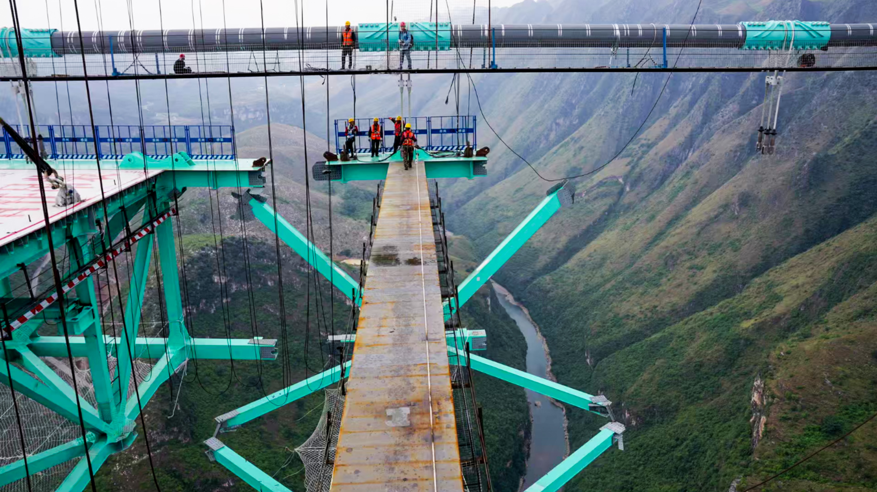 217根主缆索股在空中编织,93段钢桁梁从预制场运抵现场,猫道成为云端唯一的立足之地,每一步前行,都写满勇气与坚守。