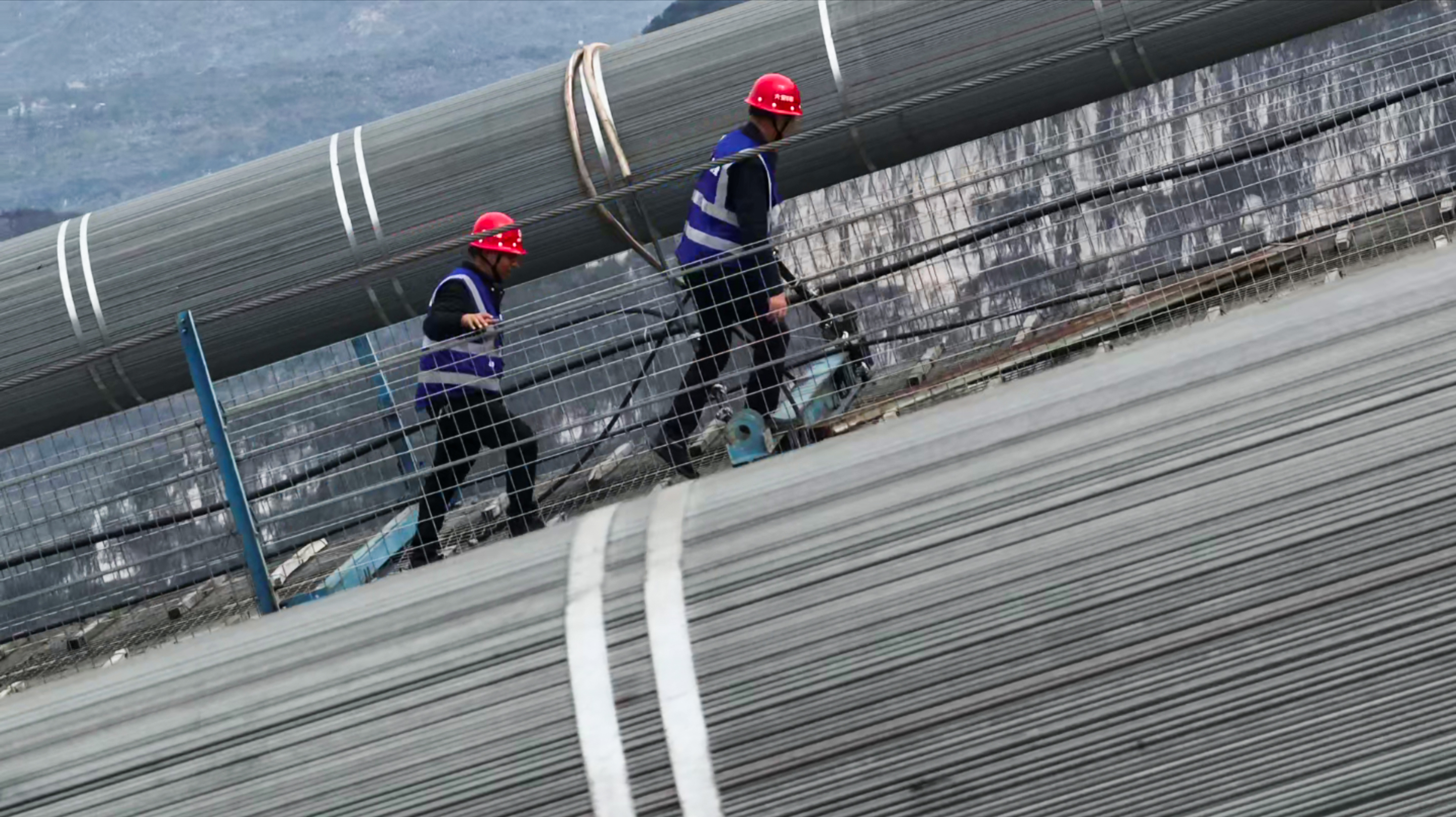 最后一块嵌缝板吊装完成,桥面全线贯通;主缆缠丝、涂装工序有序推进,建设者们为大桥披上百年防护的盔甲,用匠心守护岁月安稳。