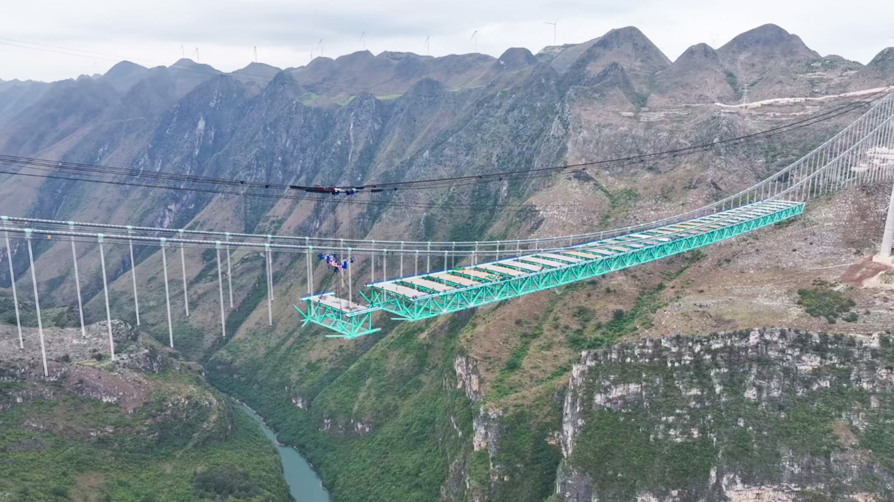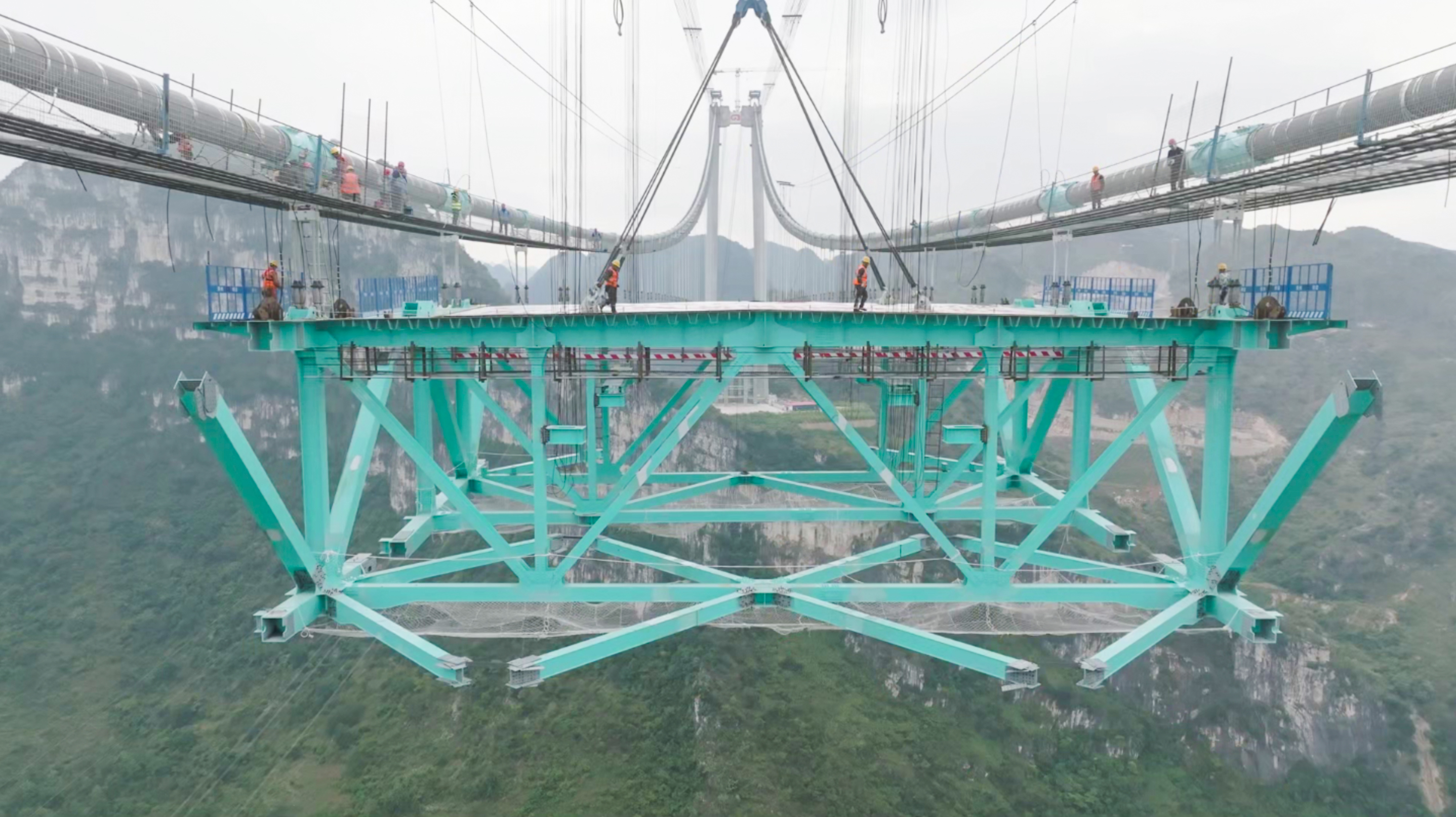 世界最大跨度缆索吊系统,如同悬在空中的“钢铁手掌”,稳稳抓起215吨重的钢桁梁,还要承受110%的极限配重。毫米级误差,在600米高空会被无限放大;每一颗螺栓、每一道焊缝,都承载着工程的安全与未来。