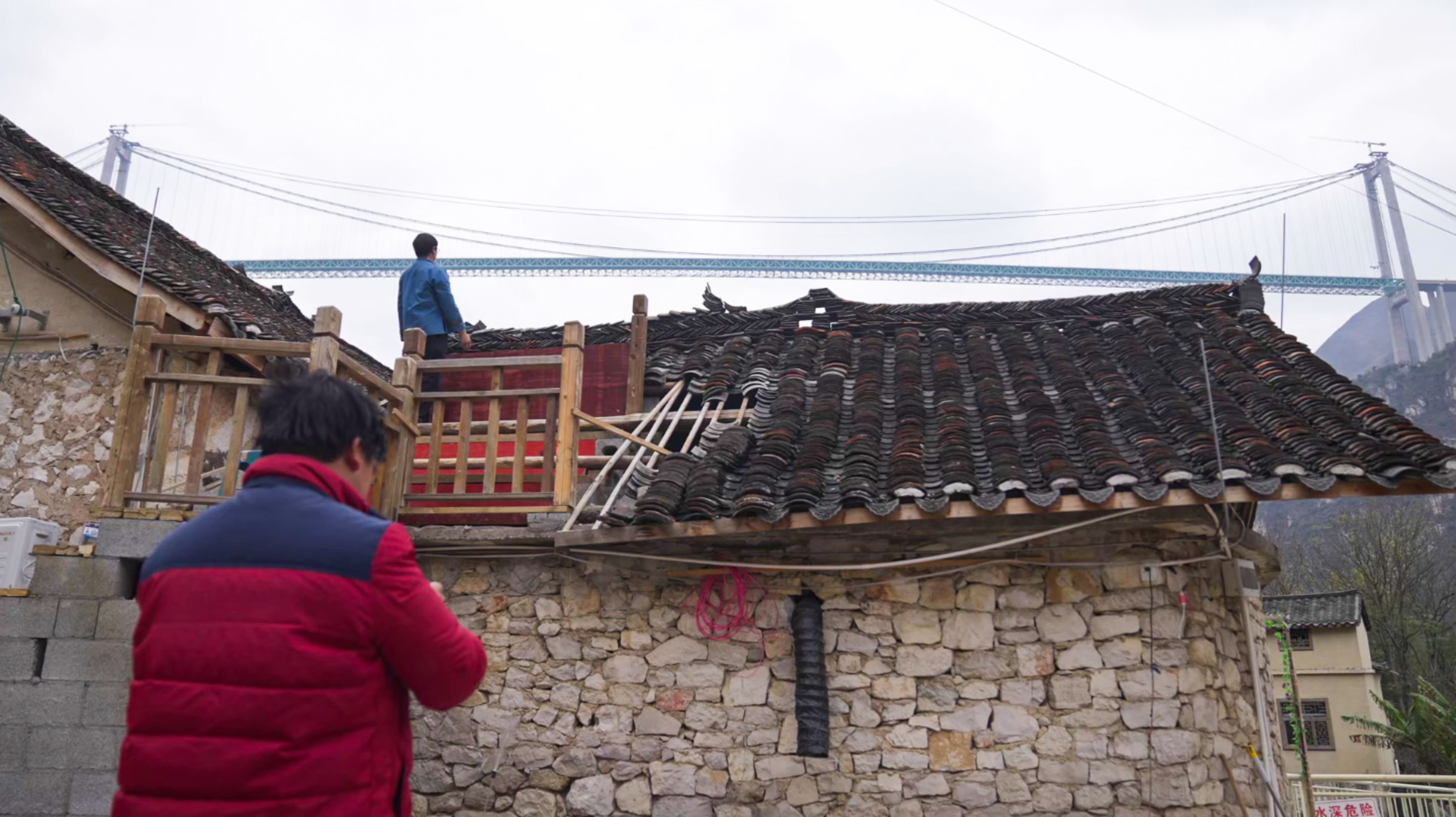 纪录片不止记录工程奇迹,更定格人间烟火的温暖瞬间。大桥之下,小花江村的小谢与小林,用无人机记录大桥成长,在桥边开起民宿,等待天堑变通途的那天。