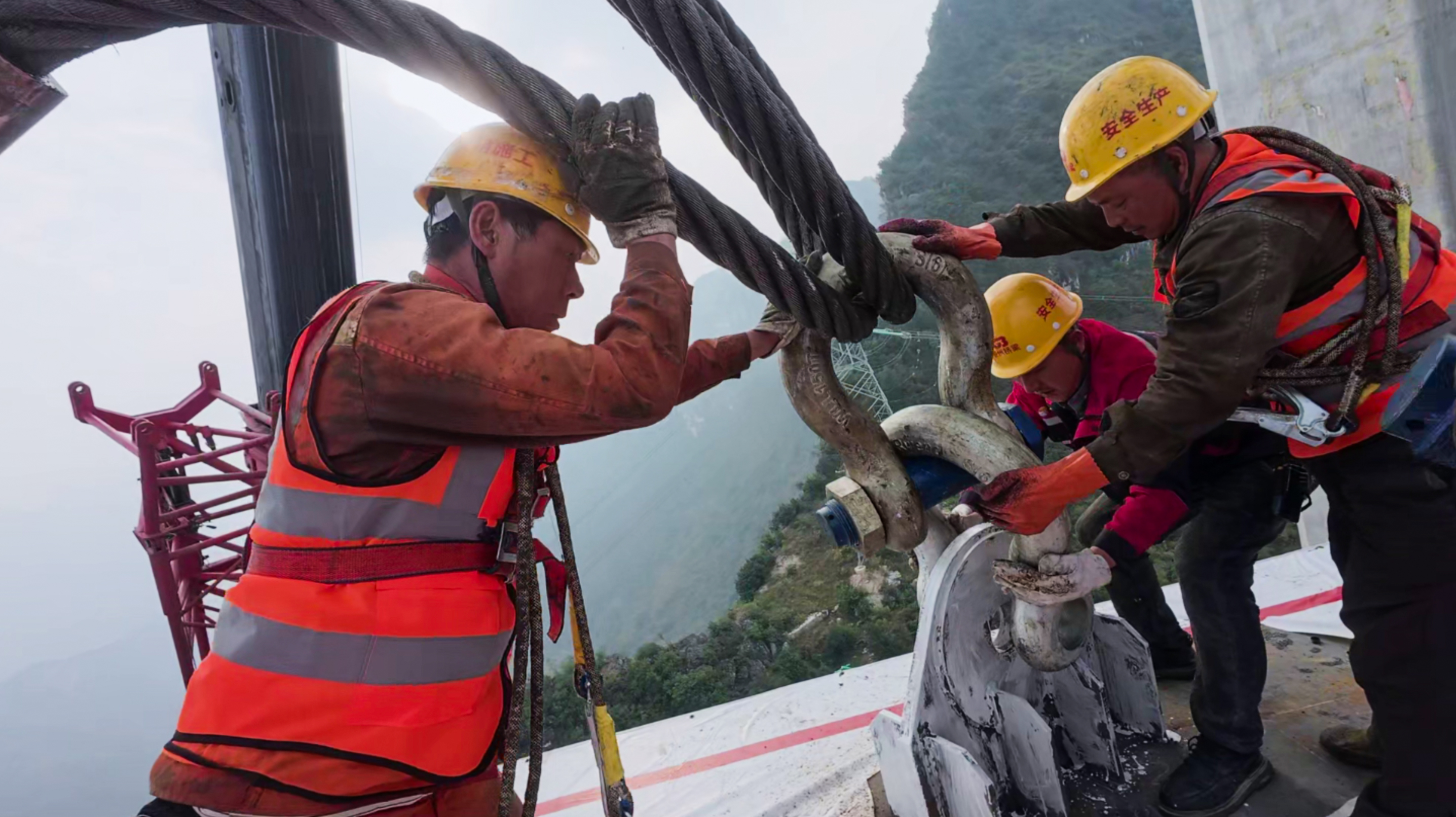 纪录片镜头里,最震撼人心的,是极限高空的生死考验。首吊之日,项目负责人吴朝明乘吊篮攀爬至作业面,吊装工莆小康身披繁复装备,在百米高空直面深渊。