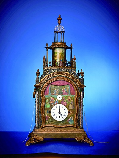 修复后的清铜镀金嵌料石转人亭式钟 沈阳故宫博物院提供