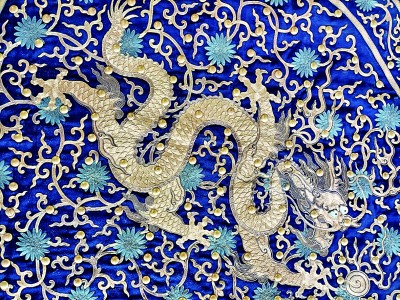 修复后的清蓝缎平金龙铜钉棉甲下裳行龙 沈阳故宫博物院提供