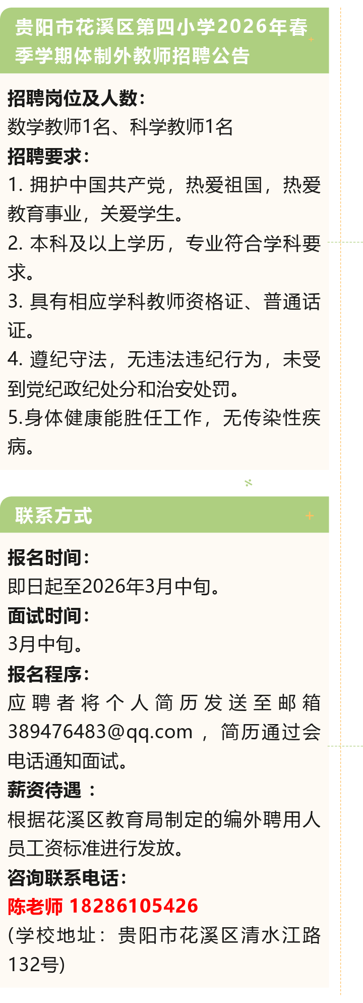 【事业单位】贵阳市花溪区第四小学招聘!正在报名!