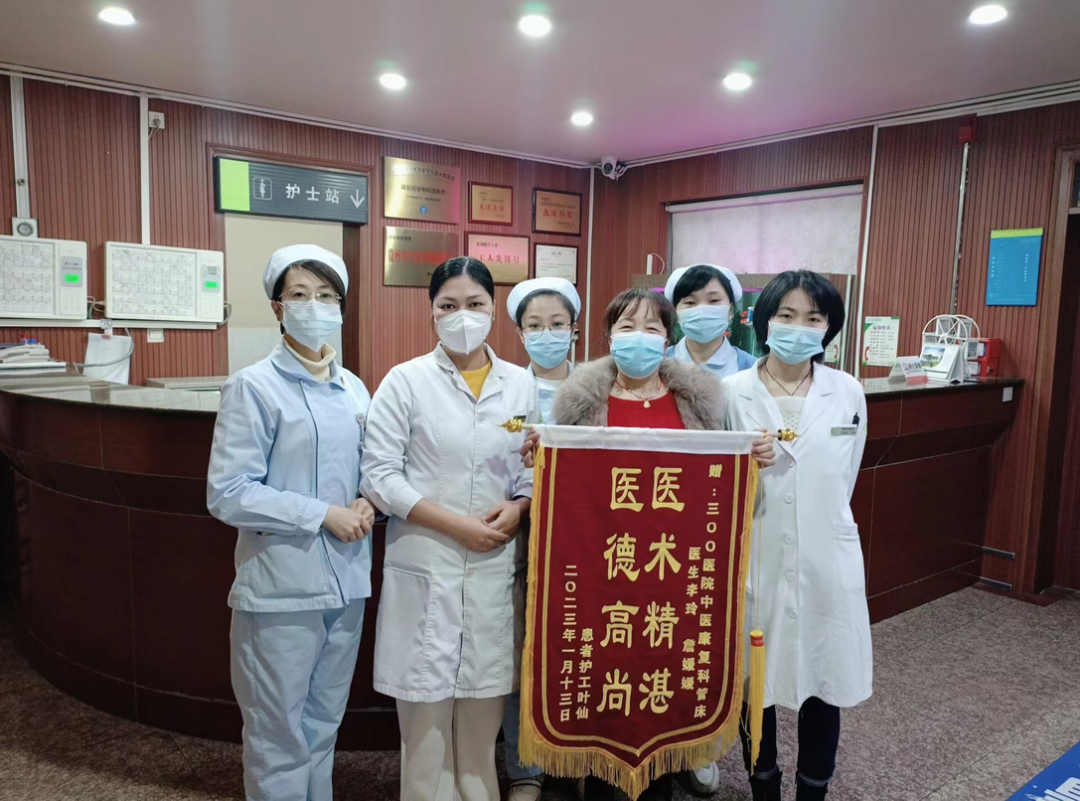 1月13日上午,一位患者捧着写有“医术精湛,医德高尚”字样的锦旗走进通用医疗三00医院中医康复科医生办公室,向管床医生李玲和康复治疗师詹媛媛表达谢意。