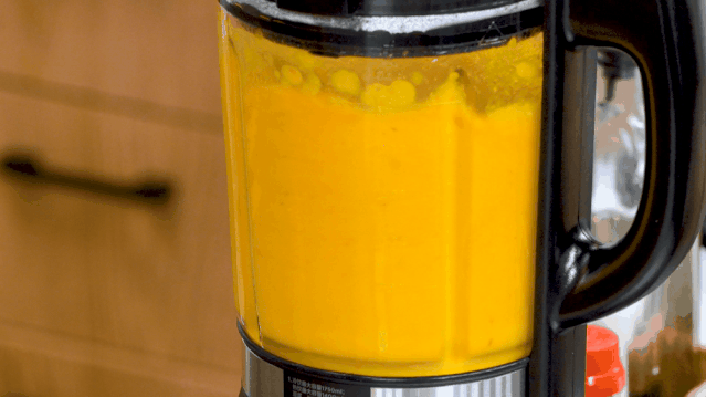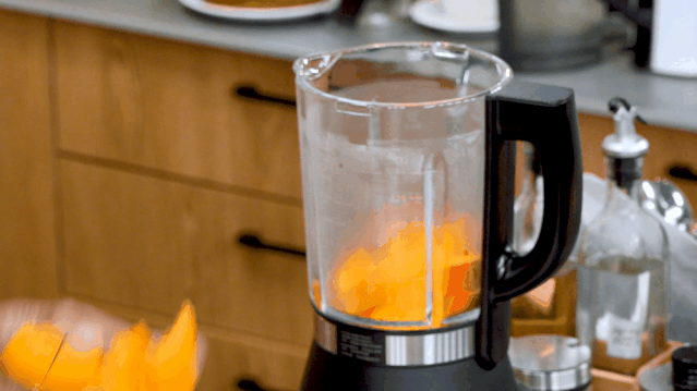 破壁机内的南瓜煮开后,进行第一次搅打。