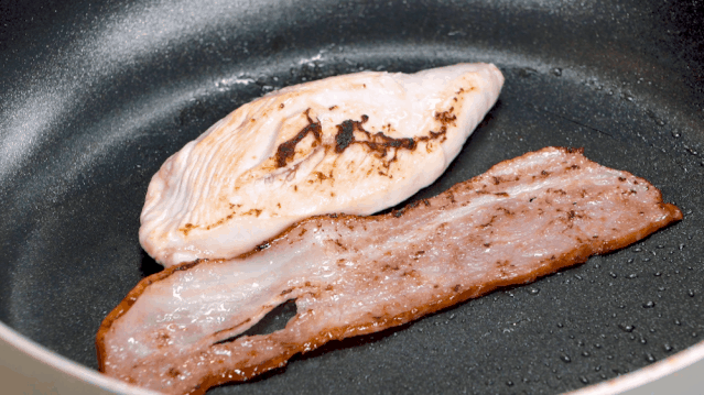 将培根煎至焦香后盛出,用培根的油脂煎鸡胸肉,并放入白胡椒和黑胡椒调味。