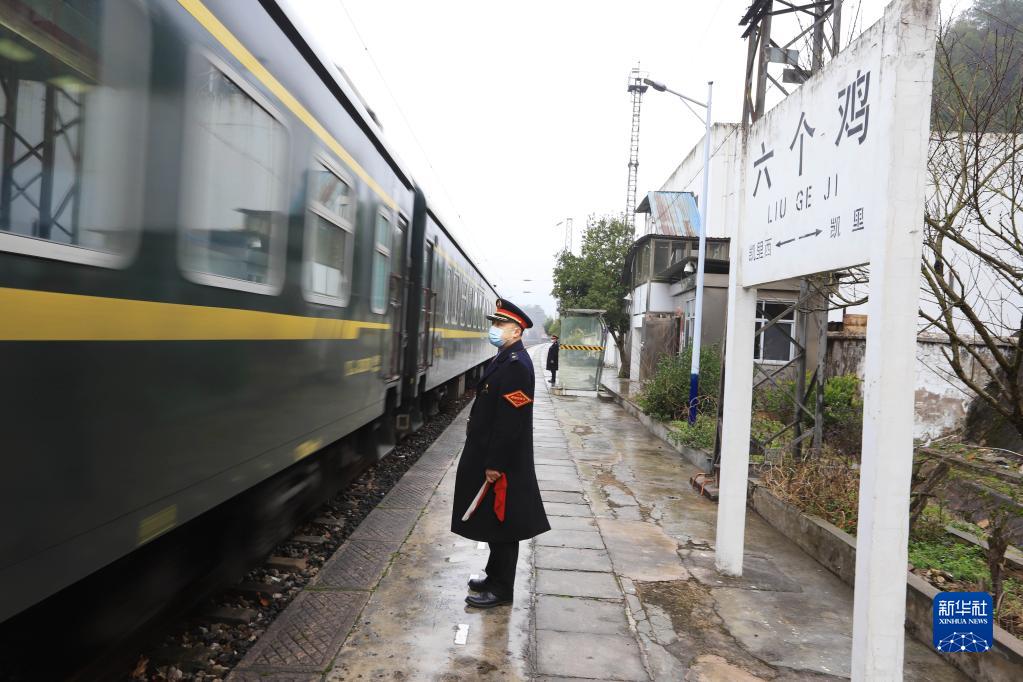 1月21日,在贵州六个鸡火车站,外勤值班员吴昌辉在站台接发旅客列车。新华社发(吴吉斌 摄)
