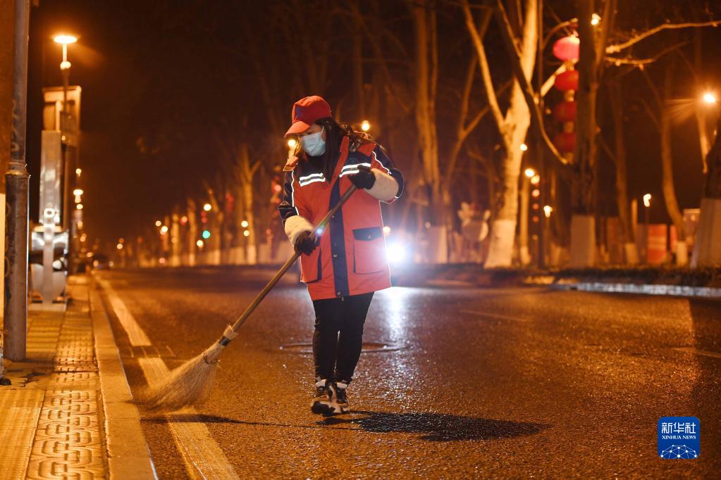 1月21日,环卫工人阮志萍在贵州省贵阳市云岩区宝山北路清扫街道。新华社发(邓刚 摄)