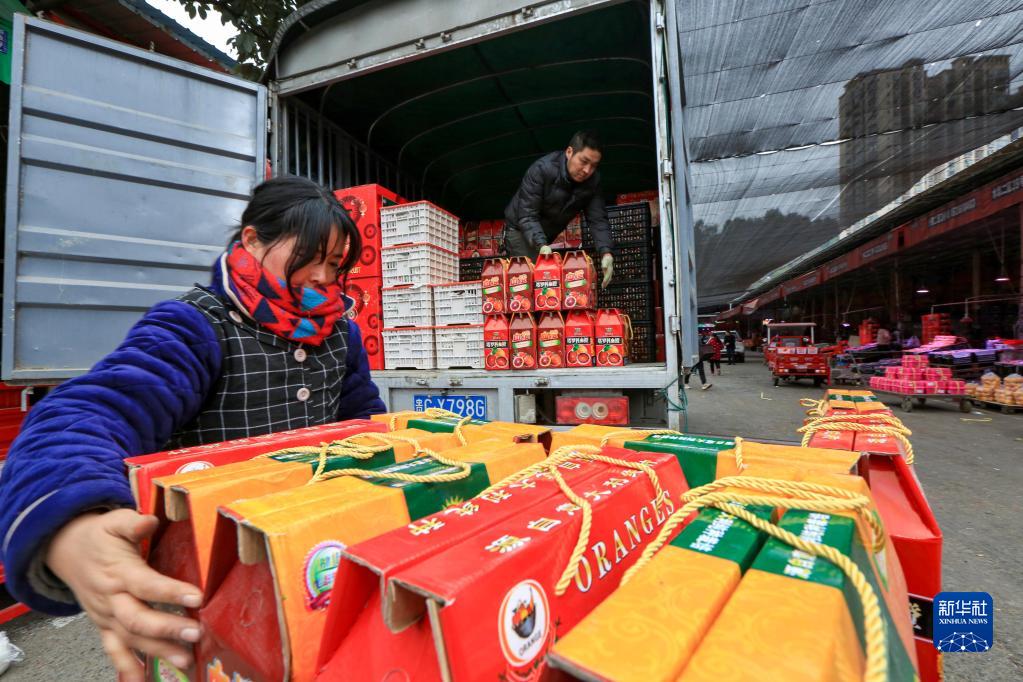 1月21日,工人在贵州省遵义市播州区龙坑街道农产品批发市场里搬运新鲜水果。新华社发(李仁军 摄)