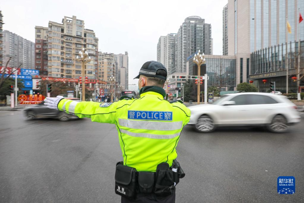 1月21日,贵州省毕节市七星关区交警大队机动中队队员指挥车辆通行。新华社发(陈曦 摄)