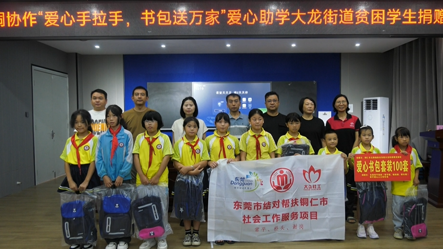 近日,“爱心手拉手,书包送万家”捐赠仪式在德龙小学举行。东莞市大众社会工作服务中心为学校100名困难学生送来了满满的爱心和关怀。