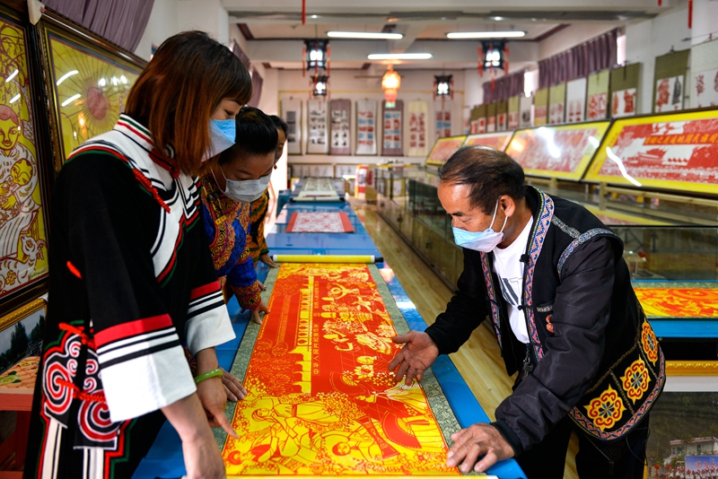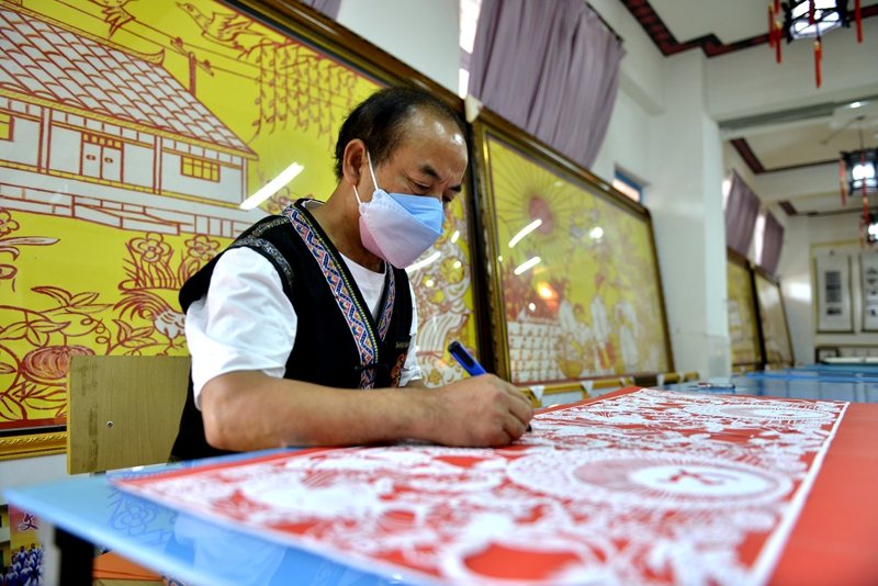党的二十大即将召开,在盘州市鸡场坪镇椅棋村,贵州民族剪纸工艺大师”金剪刀“金元汉用两个多月时间创作了两幅剪纸作品,献礼党的二十大,歌颂民族团结、祝愿祖国繁荣昌盛。