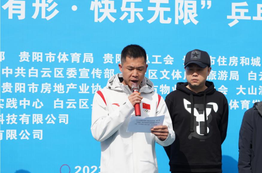 上午9时30分,随着现场音乐声响起,一首《舞动中国》开场表演开启了今天白云赛区的比赛。出席开幕仪式的领导和嘉宾有贵阳市体育局训练馆副馆长朱华伟、白云区文体广电旅游局党组书记杜晓峰、绿地集团贵阳公司营销总监昝新、白云区乒乓球协会主席伍崇权。由贵阳市体育局训练馆副馆长朱华伟同志发言并宣布白云赛区正式开赛。