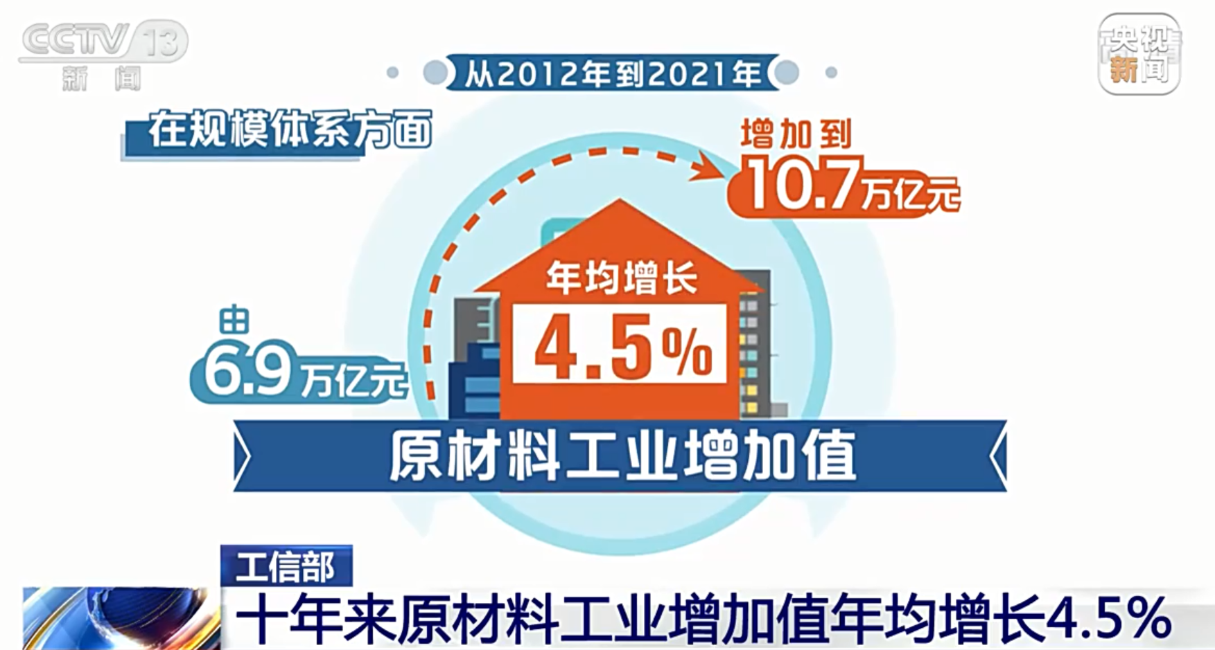 ▲从2012年到2021年,我国原材料工业增加值由6.9万亿元增加到10.7万亿元,年均增长4.5%。钢、铜、铝、甲醇、尿素、水泥、平板玻璃等主要产品产量连续多年保持世界第一。