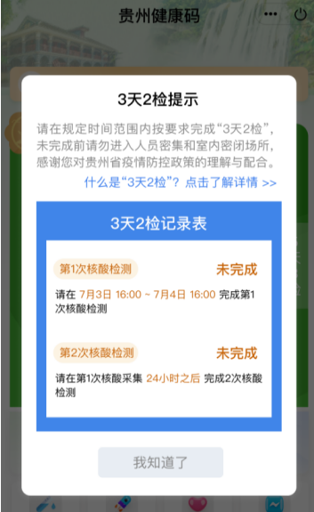 ▲注意!“贵州健康码”有调整。需落实“3天2检”的人员,打开“贵州健康码”会弹窗提示,并增加“需3天2检”标识。在第1天和第3天分别开展1次核酸检测即可变回正常。如果出现弹窗提示在首页不能取消的,仅能在居住地与核酸采样检测机构之间“点对点”流动。