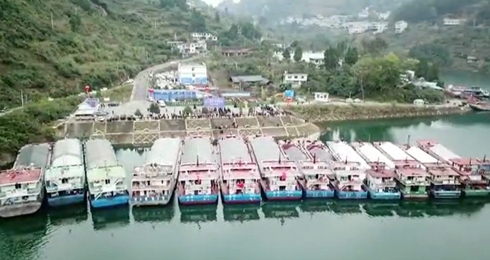 经过两个小时左右的航程,船队进入乌江航道。乌江是长江八大支流之一,也贵州第一大河,自古以来就是贵州联通外界的航运要道,因其流量充沛,流态稳定,素有“黄金水道”之美誉。2003年以来,因梯级水电站修建,“黄金水道”一度断航;2015年,完成乌江渡以下在建水电枢纽通航设施、构皮滩翻坝运输系统工程建设;2018年,随着构皮滩水电站通航设施工程建成,乌江干流通道“最后一颗纽扣”被解开,贵州“北入长江”黄金水道梦想再度实现;2020年6月,省交通运输厅与贵州乌江水电开发有限公司就乌江航道通航设施运行维护管理达成协议,标志着乌江水运发展进入新阶段。