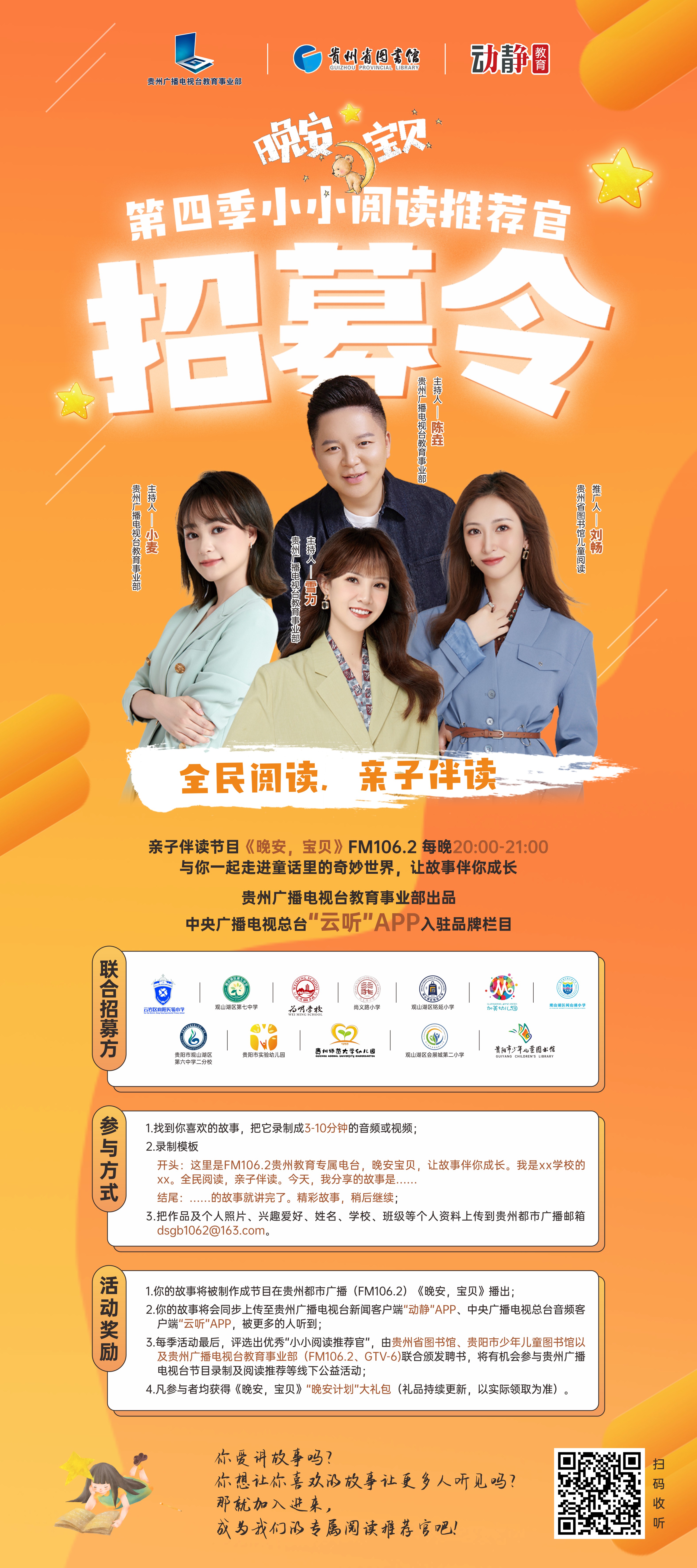 幸福童话由你来分享,我们计划在全省范围内招募FM106.2贵州都市广播的“《晚安,宝贝》小小阅读推荐官”。