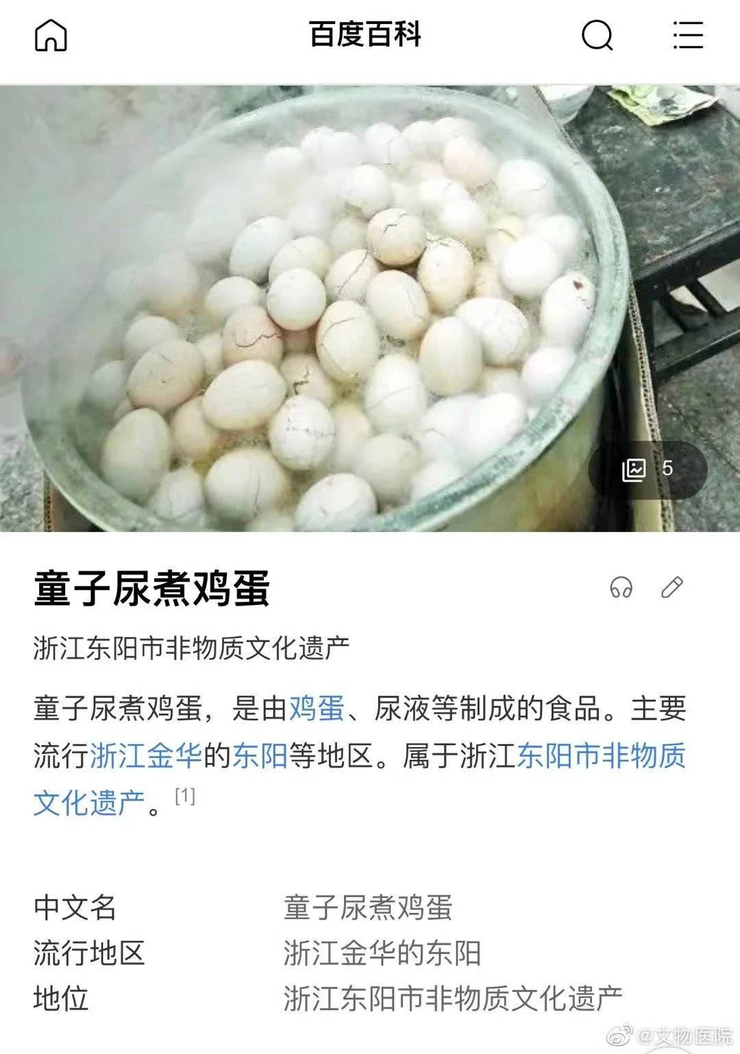 2月27日,浙江金华。女子用童子尿煮鸡蛋遭网友吐槽无法接受。当事人卢女士称,这个是浙江东阳的非物质文化遗产,一到春季取10岁以下男童的尿将鸡蛋煮24小时后食用。因为男童尿中有一种叫人中白的成分,据说吃了夏天不会中暑。这些尿液都是自己去幼儿园里接的,煮出来的鸡蛋就跟臭豆腐一样,闻起来是臭的,但是吃起来很香,是咸咸的味道。
