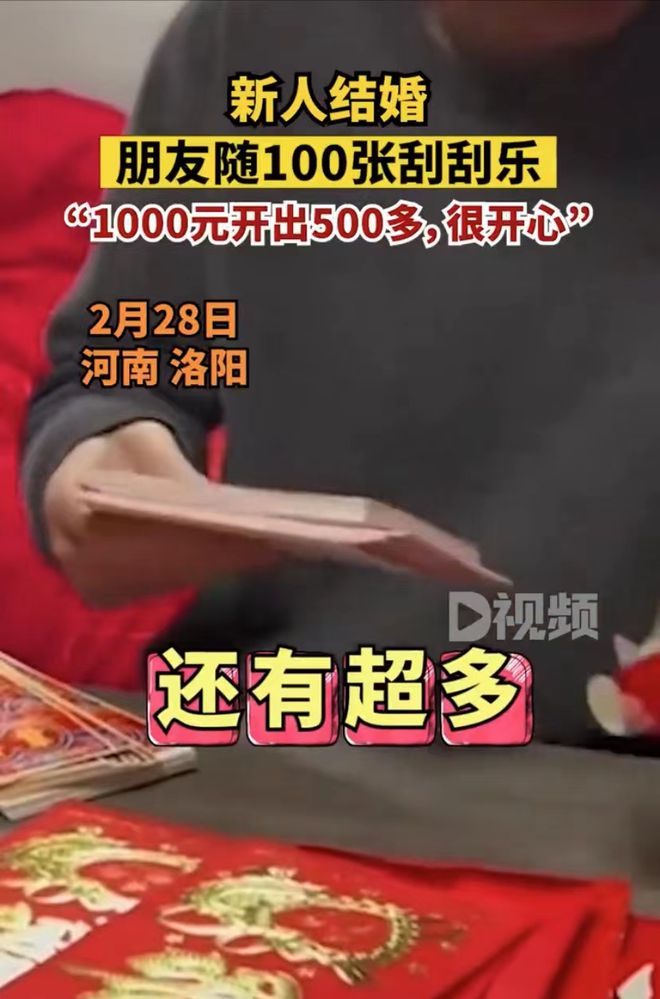 2月28日,河南洛阳。张女士结婚当天,收到朋友送的100张刮刮乐。张女士称,第一次收到这种礼物比较惊奇,之前一起吃饭时,朋友说要送刮刮乐,没想到真送了,朋友一直激动地问刮了多少,最后1000元开出了500多元,虽然赔了但很开心。