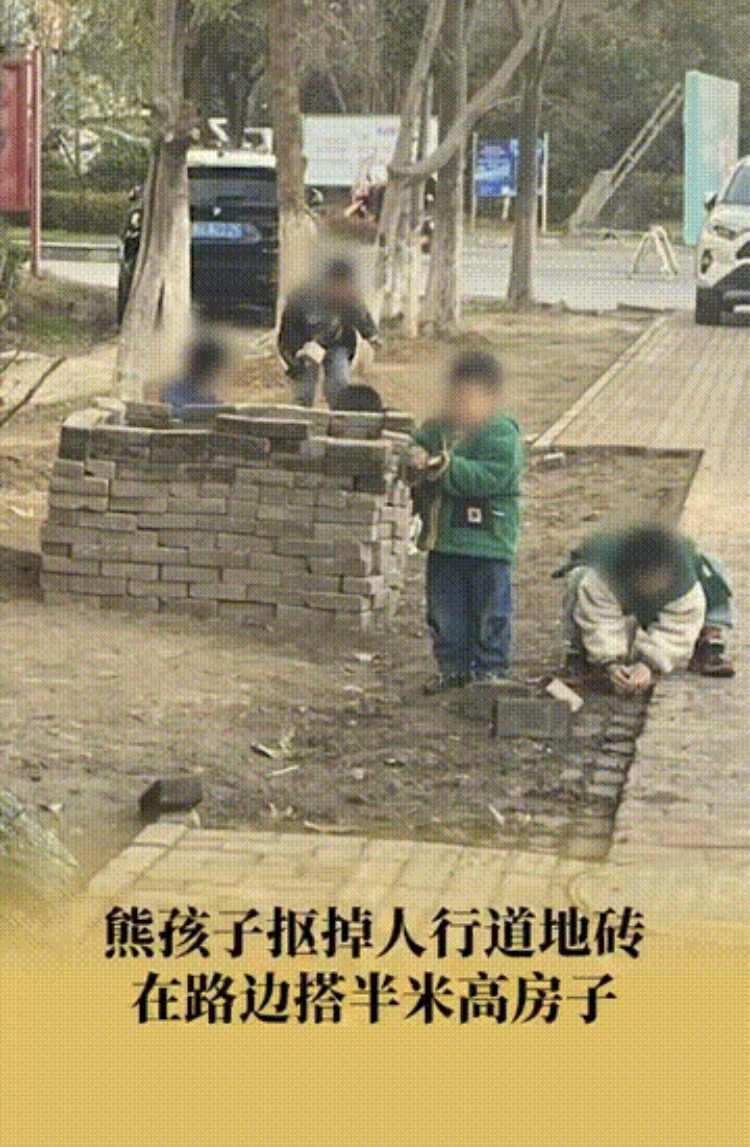 近日,安徽铜陵。郑女士回家路上发现几个小孩在人行道上地砖盖房子。据郑女士介绍,自己看到时砖已经堆了半米高了,当时没有家长去制止。第二天自己再去看时,堆起来的“房子”已经被拆掉,但砖还没铺回人行道上。希望家长看到能教育一下小孩,这种行为挺危险的,也不文明。