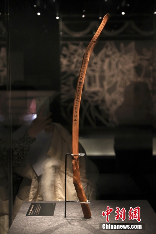 在“居延汉简”专题展厅,参观者拍摄汉代相利善弊剑册(仿制品)。
