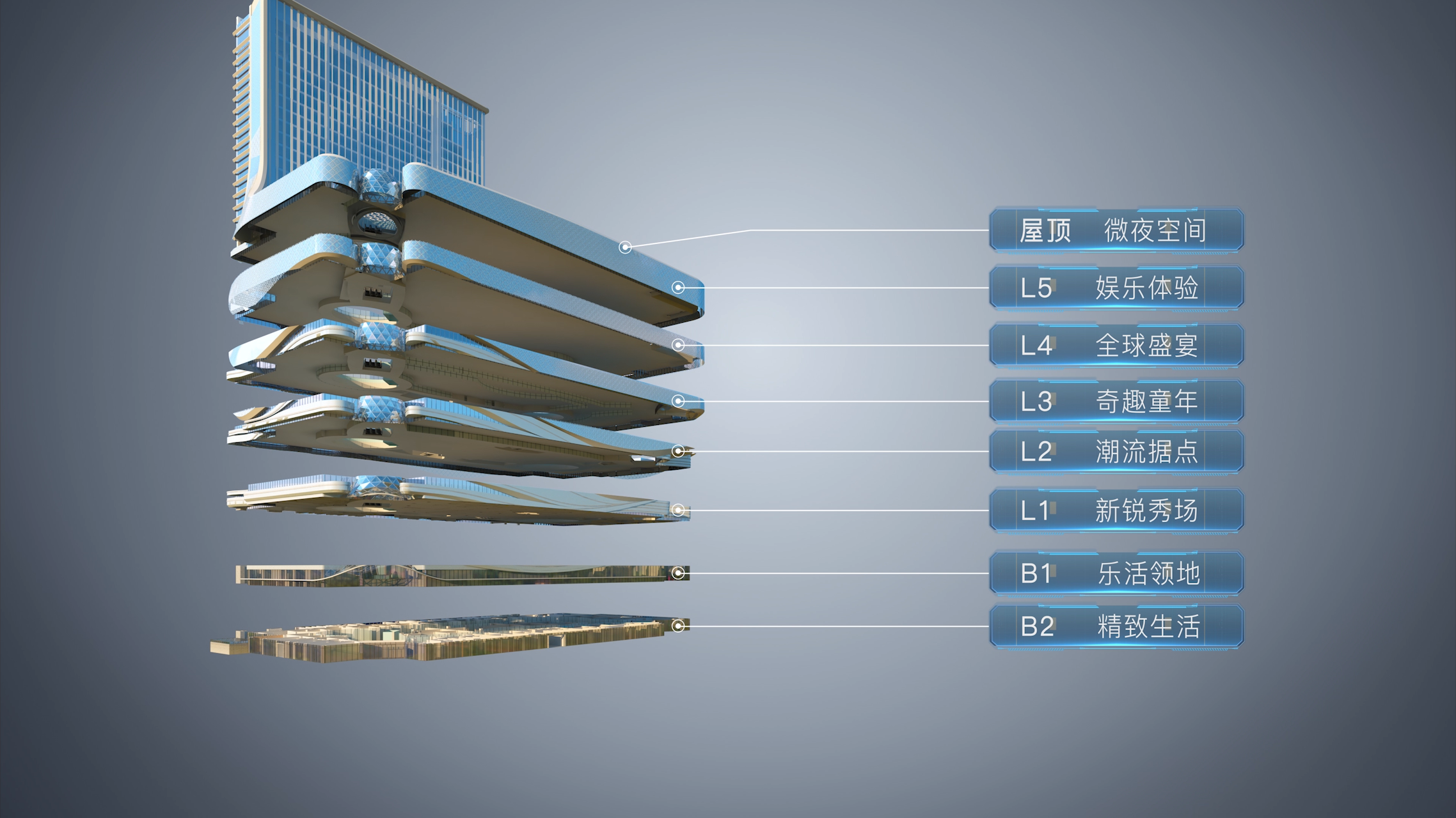 项目商业空间涵盖B2-L5、屋顶空间,并对每层空间进行了差异化定位。其具有运营技巧的主力店引入和主题区域的打造令人印象深刻。项目拟引入万达影城、點都德、KFC、奈雪的茶、Tim's咖啡、MF life、喜燃、奇乐岛儿童乐园、挺惠买等品牌。这些品牌覆盖零售、餐饮、儿童亲子、生活服务等业态,可以说将多维提升项目周边及贵阳城区的生活品质。