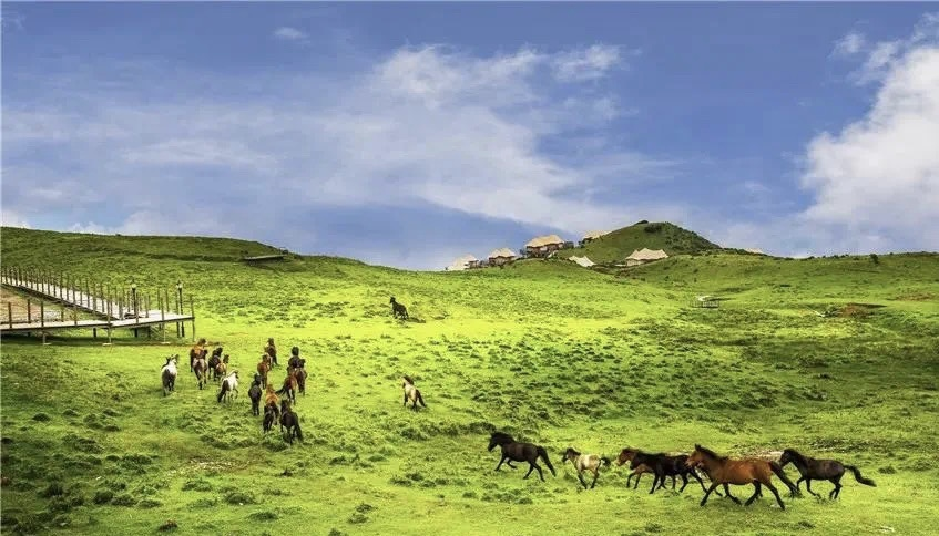 成片的草原上,三两成群的牛羊惬意地吃着草,如果想策马奔腾,你也可以选一匹心意的马儿,奔驰在草原上,尽情撒欢。