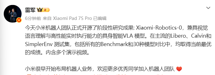 雷军:今天小米机器人团队正式开源了阶段性研究成果