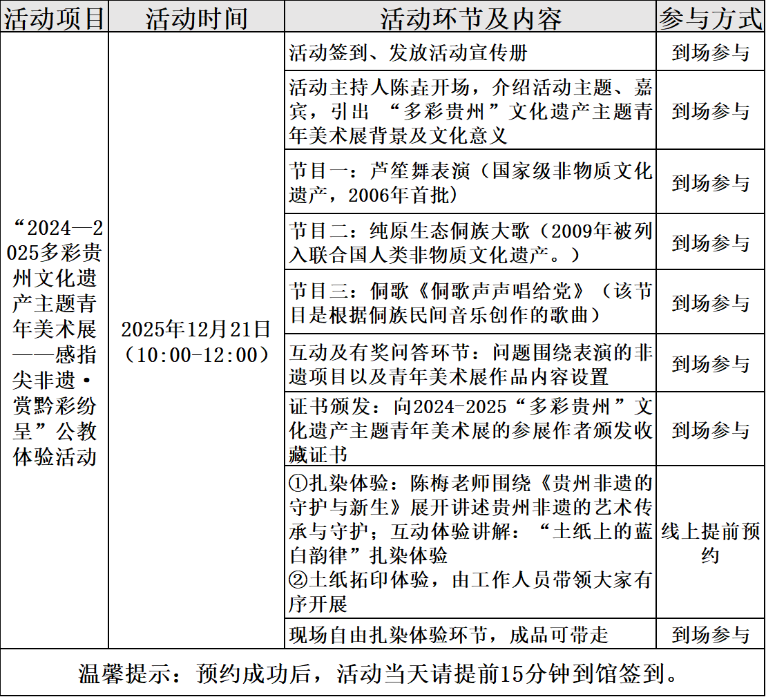 2025年12月21日(周日),由中共贵州省委宣传部、贵州省文化和旅游厅主办,贵州画院(贵州美术馆)承办的“2024—2025多彩贵州文化遗产主题青年美术展公教体验活动——感指尖非遗·赏黔彩纷呈”将于贵州美术馆一楼仪式大厅开展。