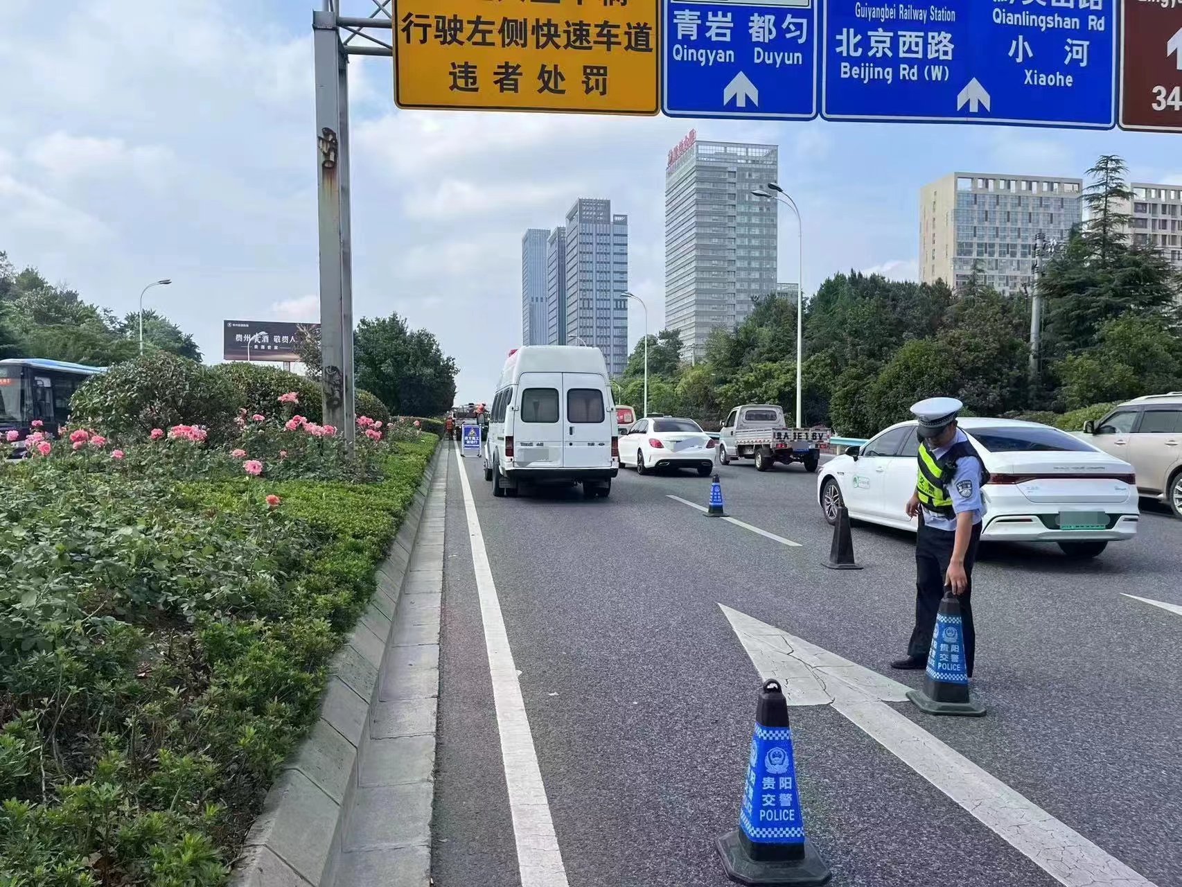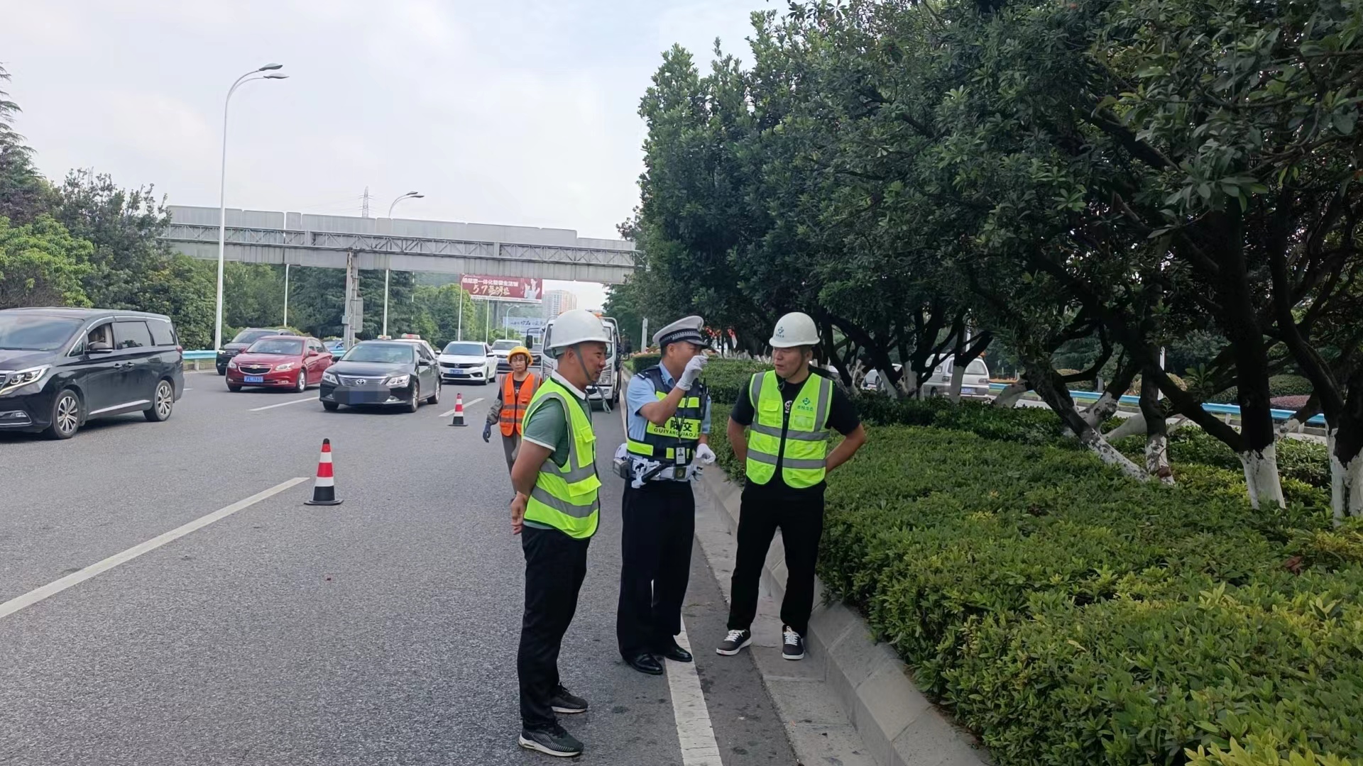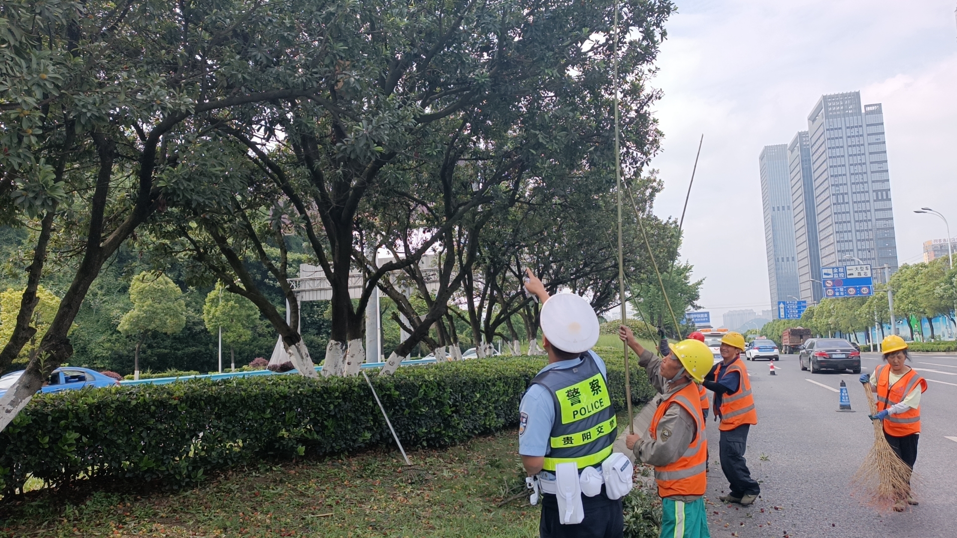 6月7日早9点早高峰结束,二中队主动联系绿化部门针对辖区西二环路段,中央绿化带的城市景观树杨梅树进行敲落、清理,避免市民横穿马路去摘采。
