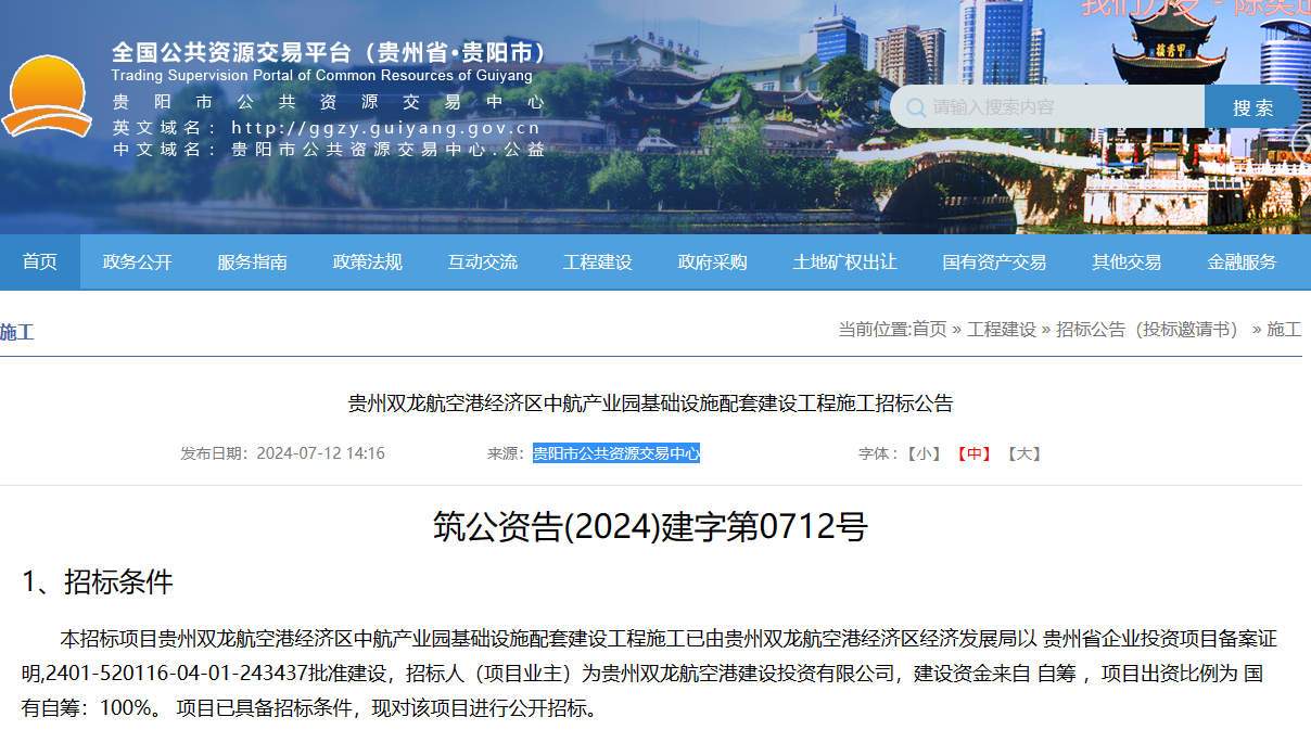 7月12日,贵阳市公共资源交易中心官方发布贵州双龙航空港经济区中航产业园基础设施配套建设工程施工招标公告,该项目建设工程施工已由贵州双龙航空港经济区经济发展局以贵州省企业投资项目备案证明,2401-520116-04-01-243437批准建设,招标人(项目业主)为贵州双龙航空港建设投资有限公司,建设资金来自自筹,项目出资比例为国有自筹:100%。 项目已具备招标条件,现对该项目进行公开招标。