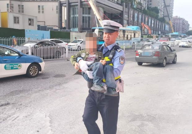近日,贵阳市经开区交警在转盘执勤时,发现一名儿童从路口窜出,横跨几个车道后逆向在快车道内奔跑,并不停四处张望。此时正值早高峰,机动车道内车辆来来往往纷纷避让,情况十分危险。民警立即奔跑上前,将孩子抱起走向安全路段。