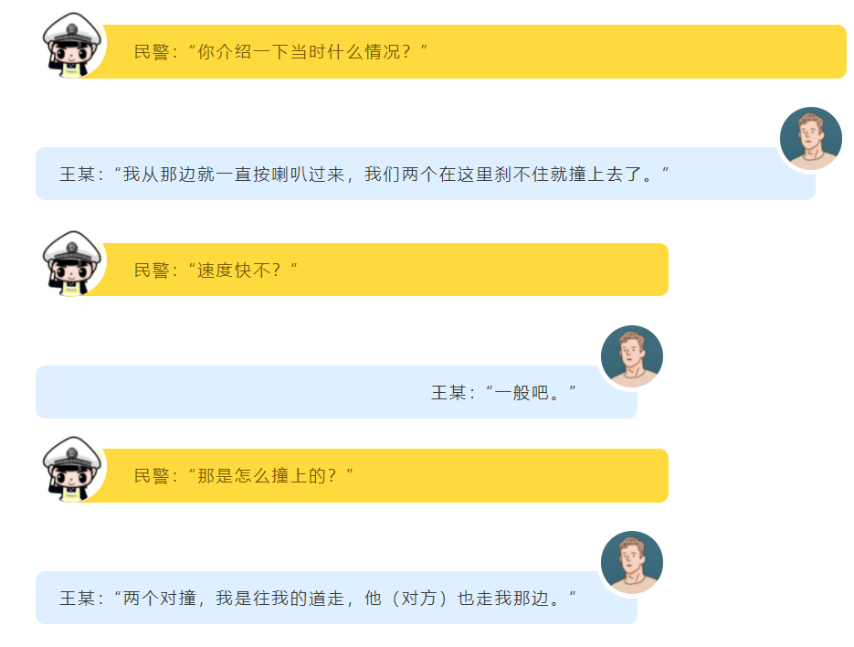 “我们在现场看见两车车头损坏较为严重,碎屑洒落一地,车辆水箱都被撞坏,我们随即对现场展开勘查,疏散无关人员,调取现场公共视频还原事发经过。”