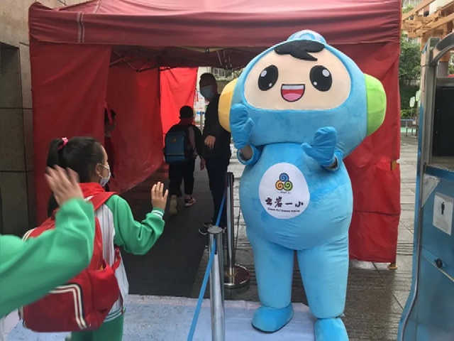 “Hi,亲爱的同学们,欢迎你们回家。”孩子们看到可爱的吉祥物,也边挥着小手边笑着回应道:“梦梦你好!”“恒恒我好想你啊。”